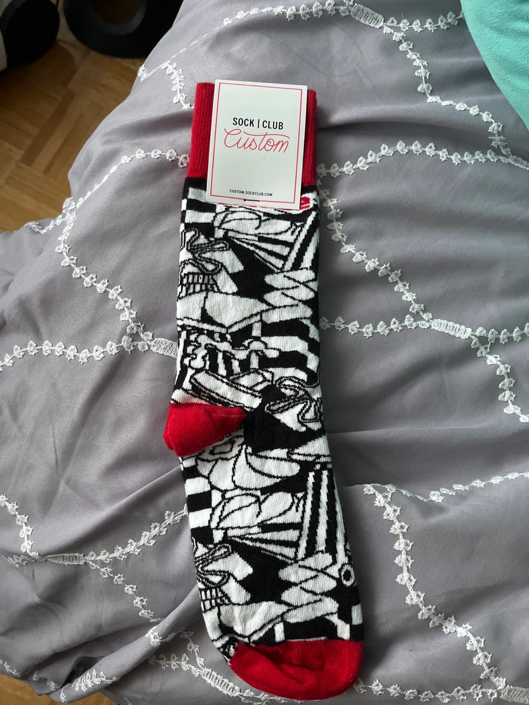 Unique custom designed socks. Black and white pattern with red accents. 75% cotton, 21% nylon, 4% spandex. Made in the USA. Gender-neutral