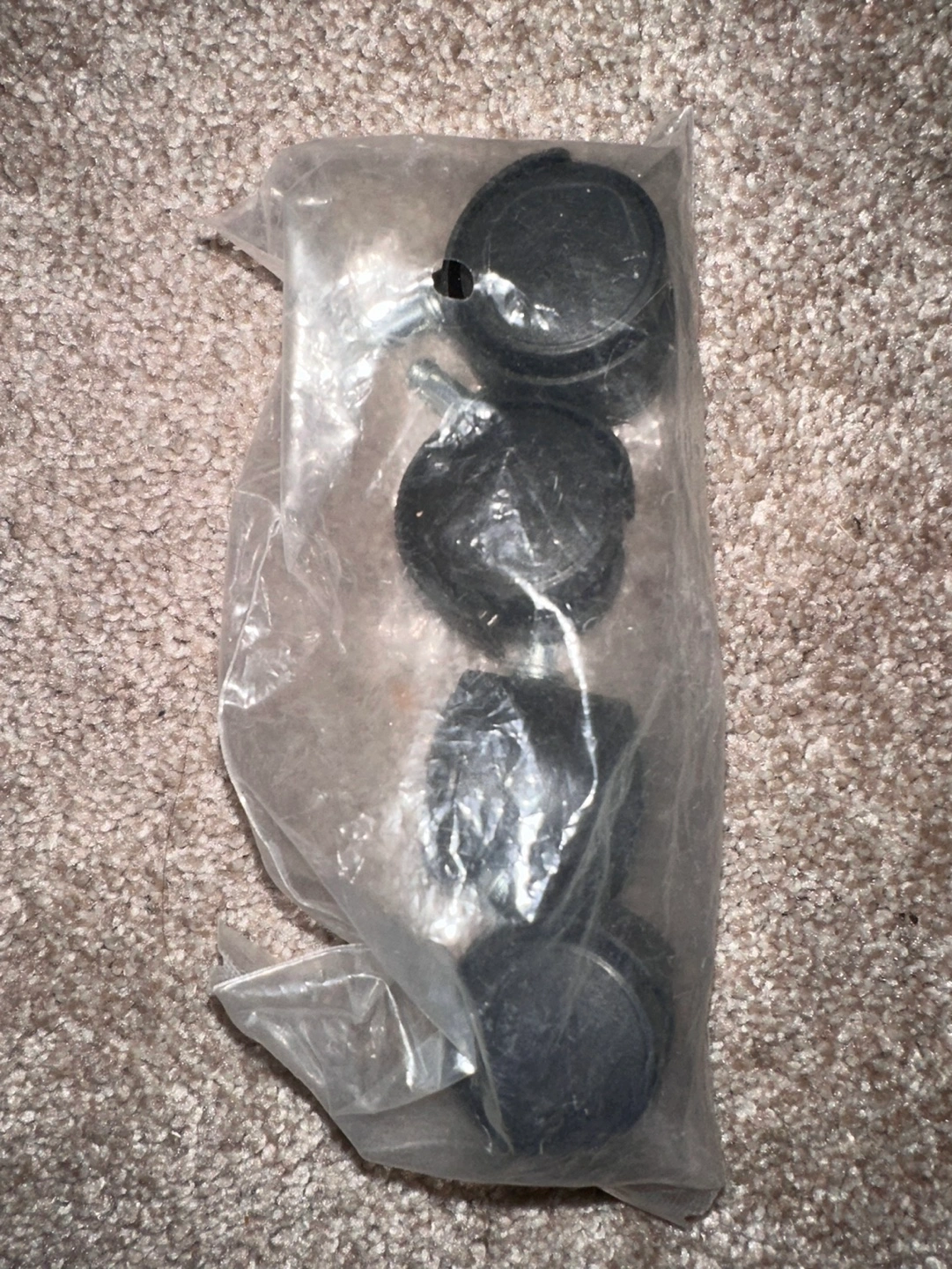 Set of four black caster wheels. Includes mounting hardware. New, in original packaging.