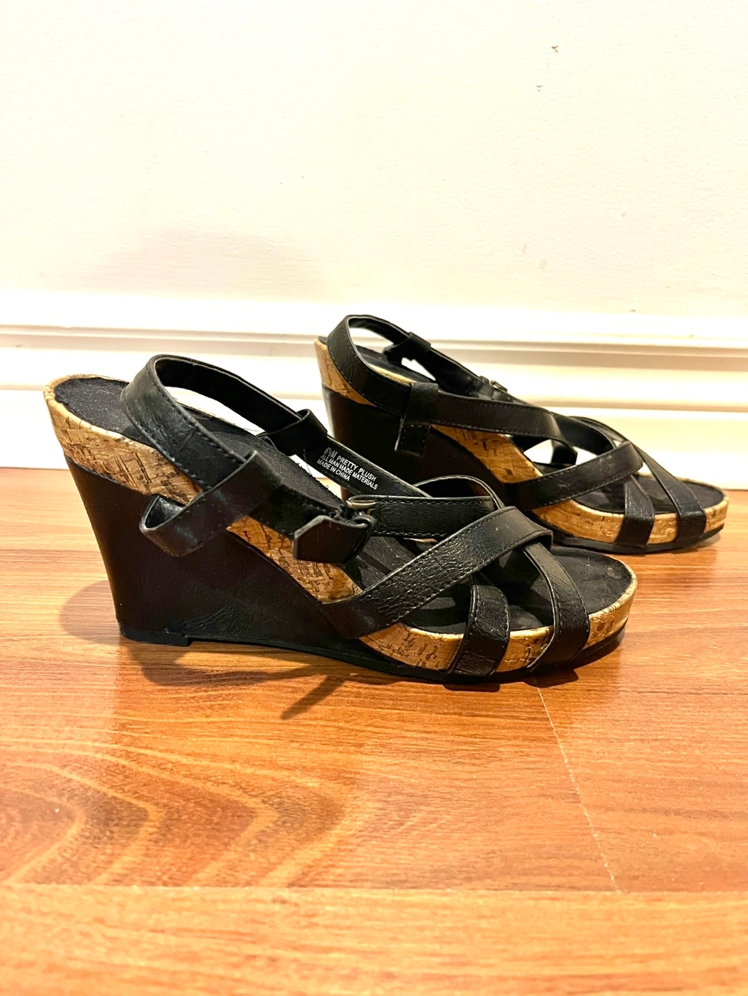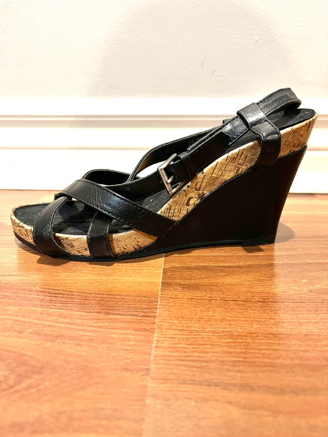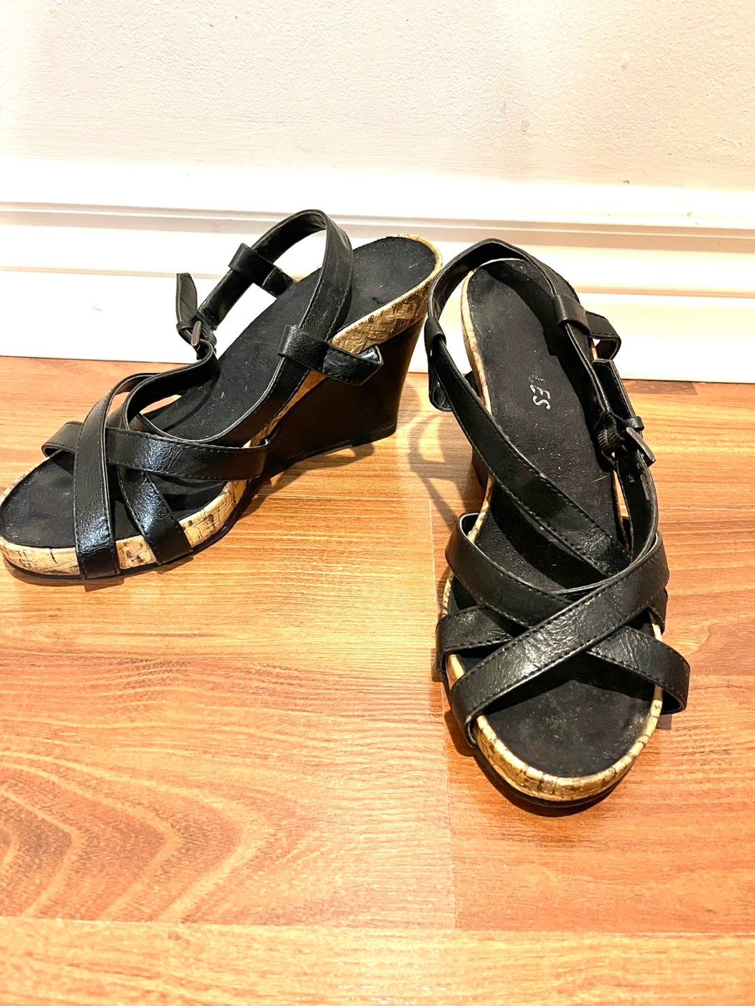 Women's black leather wedge sandals. with a cork wedge heel. Ankle strap with buckle closure. Crossover straps on the foot. Only worn a few times. Size 6.5 Pickup Palmerston/Little Italy