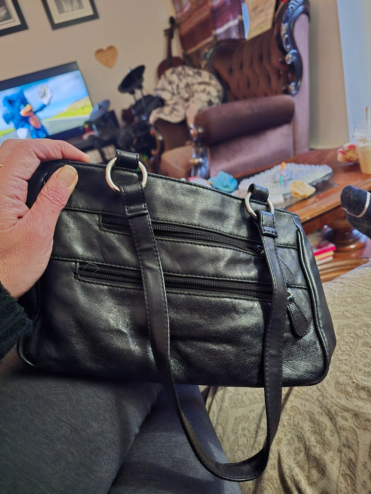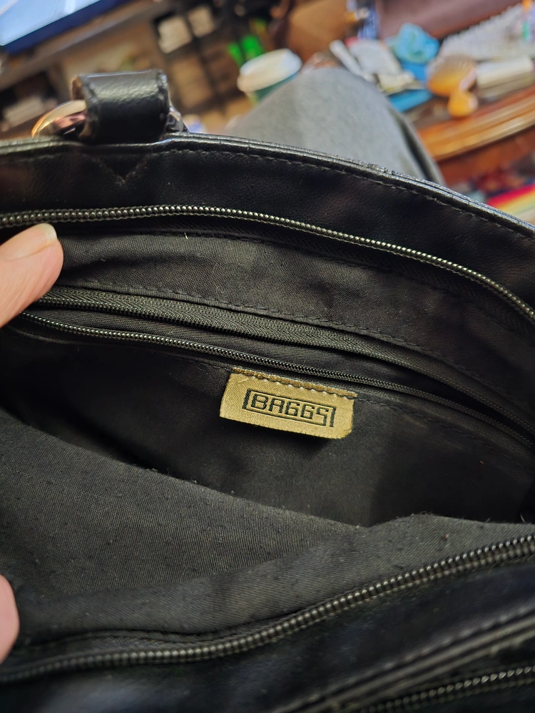 Small black leather handbag. Double zipper closure. Interior zippered pocket. Top handles.
