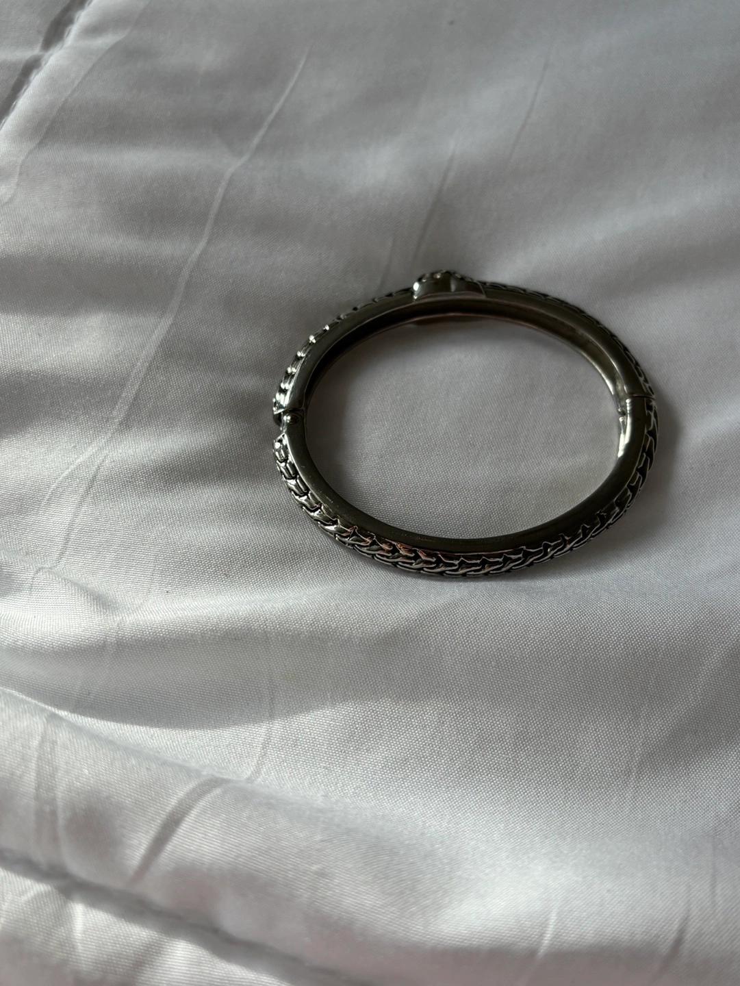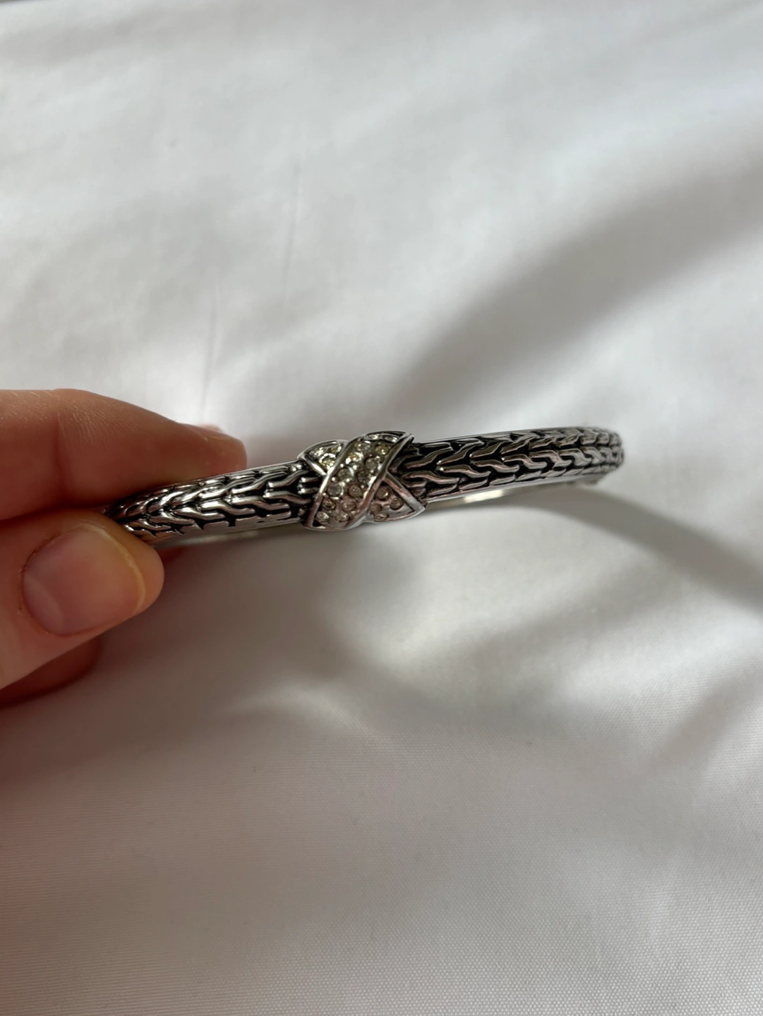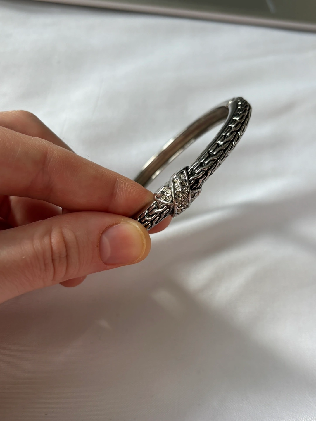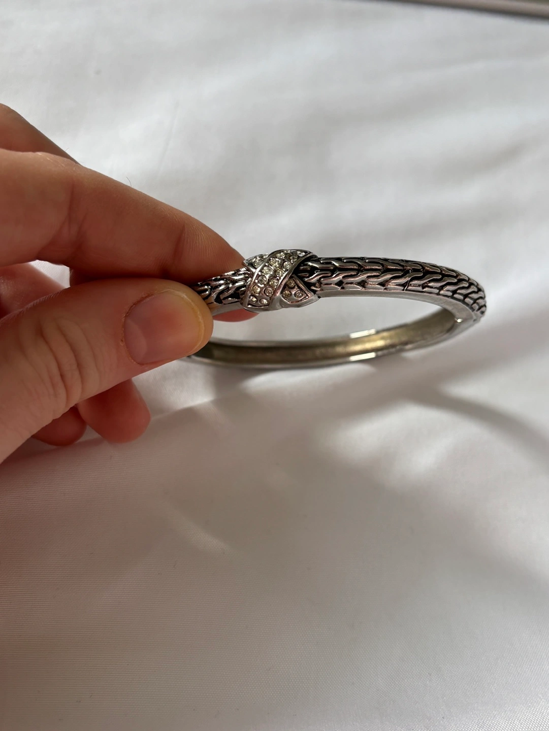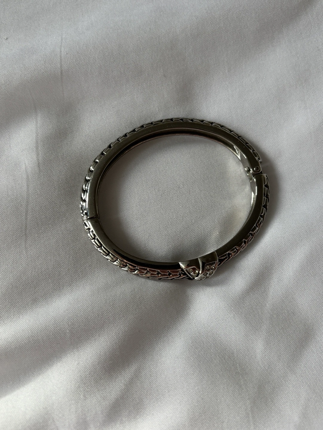 Silver tone metal bangle bracelet. Features a textured design and clear stone accented “x” design. Hinged closure. Elegant and stylish. Weighs 27 g. Cash only. Pick up at RBC Bathurst and Sheppard or see my bio for other location options! I’m available to answer any questions :) #silver #bracelet #jewelry