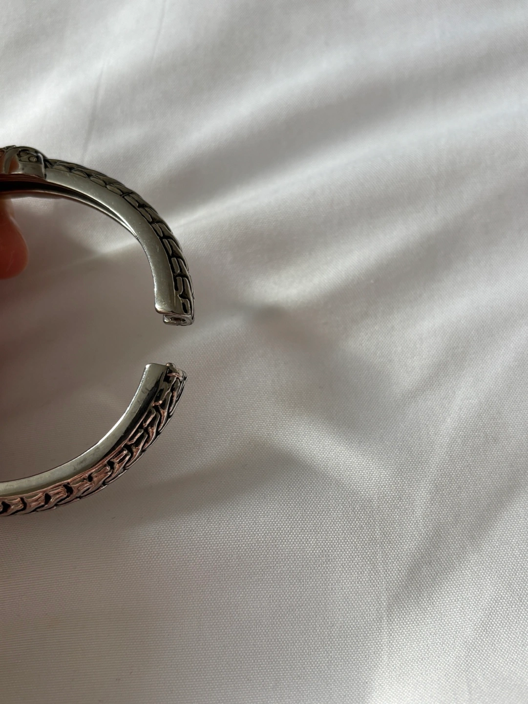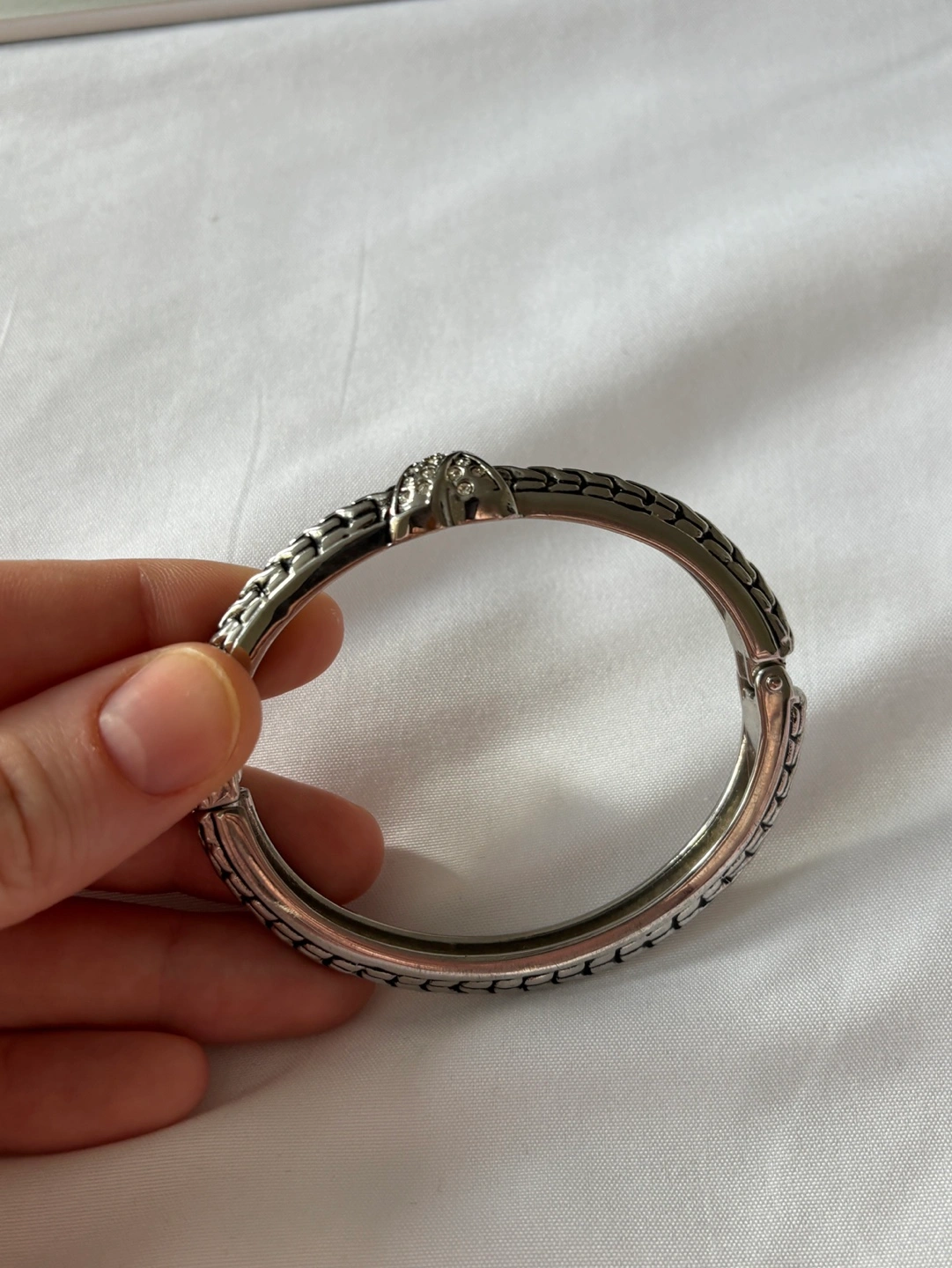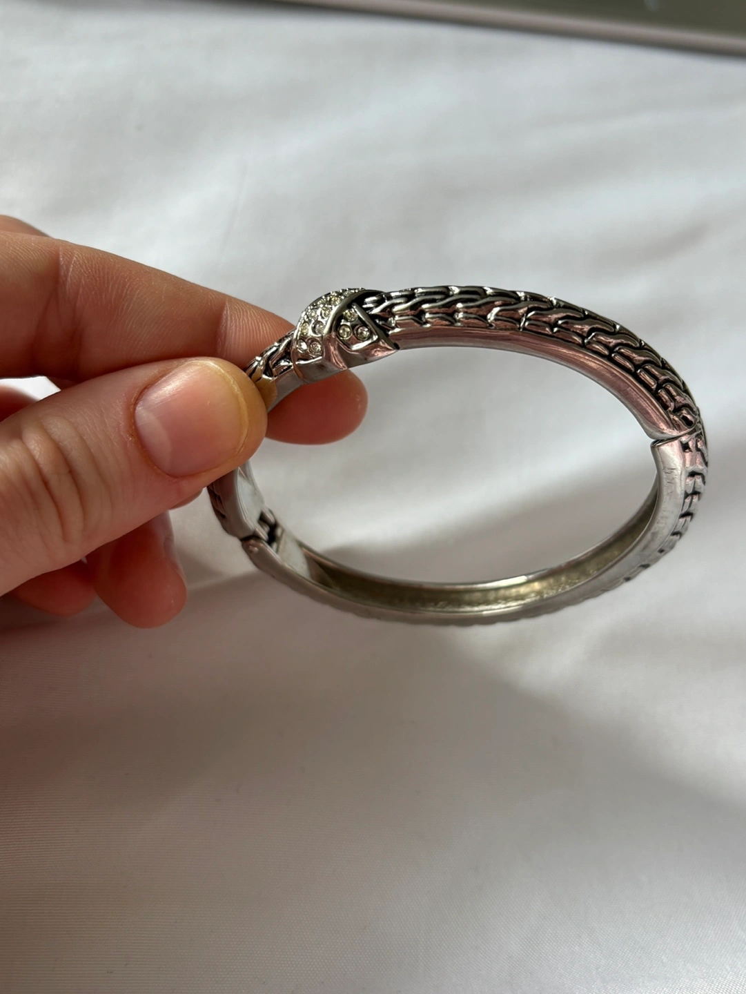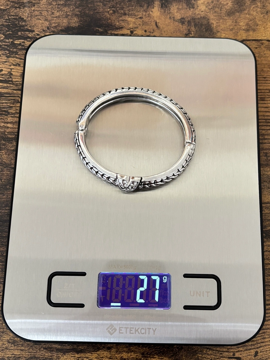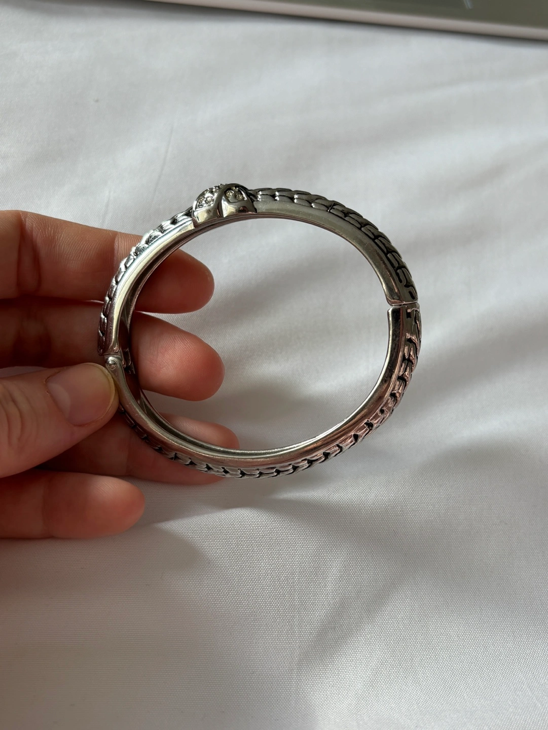 Silver tone metal bangle bracelet. Features a textured design and clear stone accented “x” design. Hinged closure. Elegant and stylish. Weighs 27 g. Cash only. Pick up at RBC Bathurst and Sheppard or see my bio for other location options! I’m available to answer any questions :) #silver #bracelet #jewelry