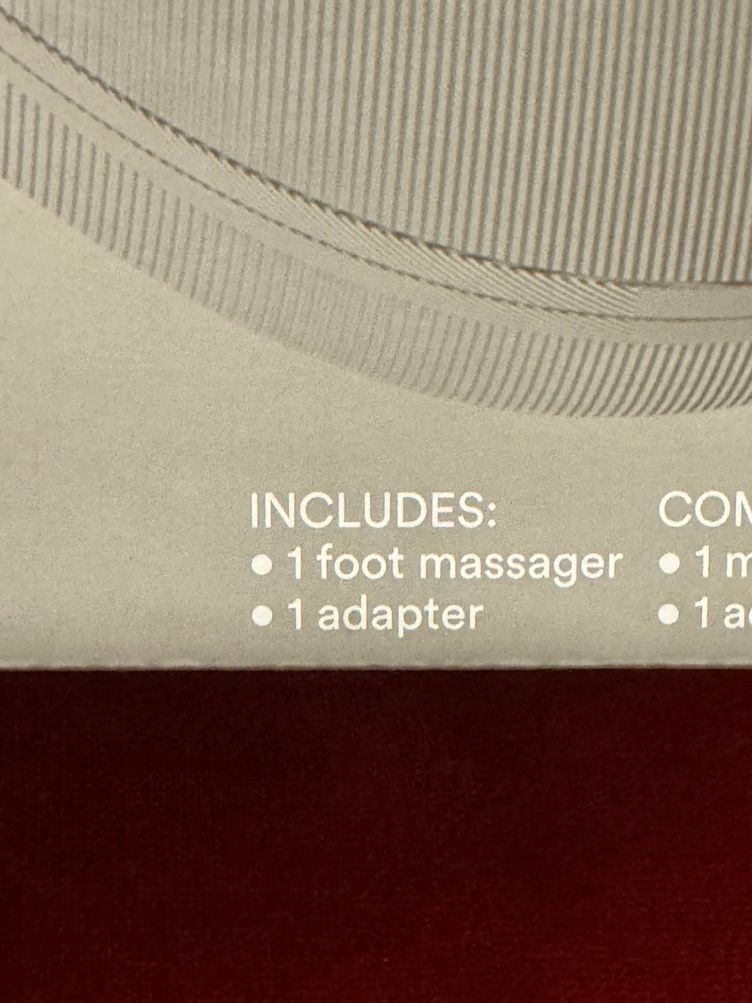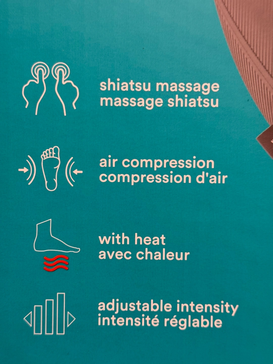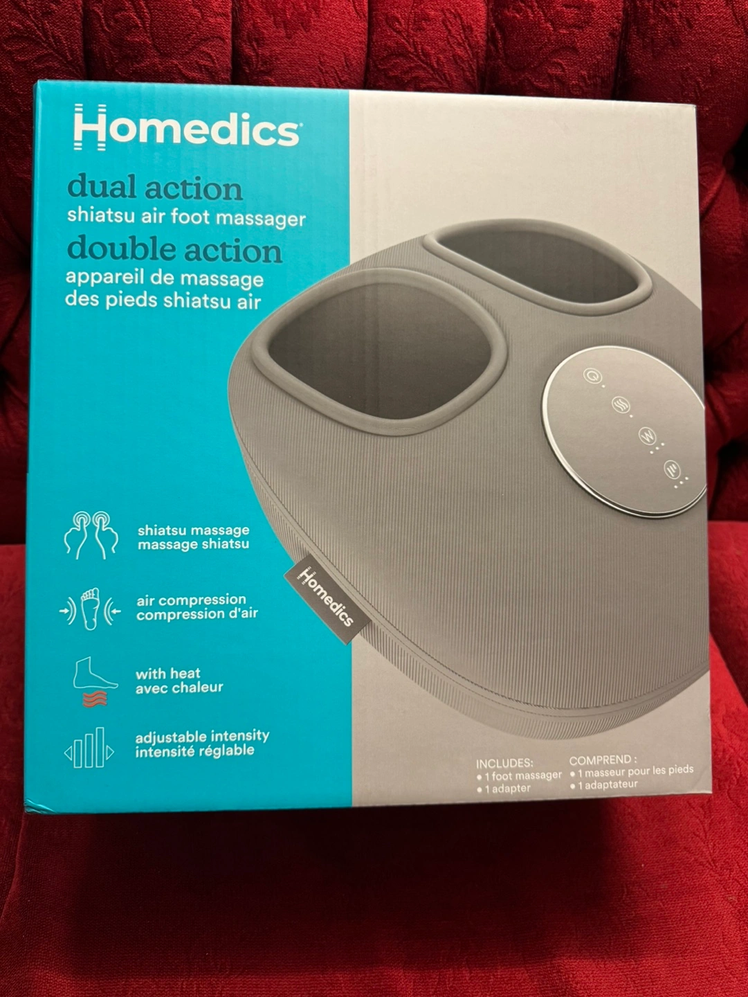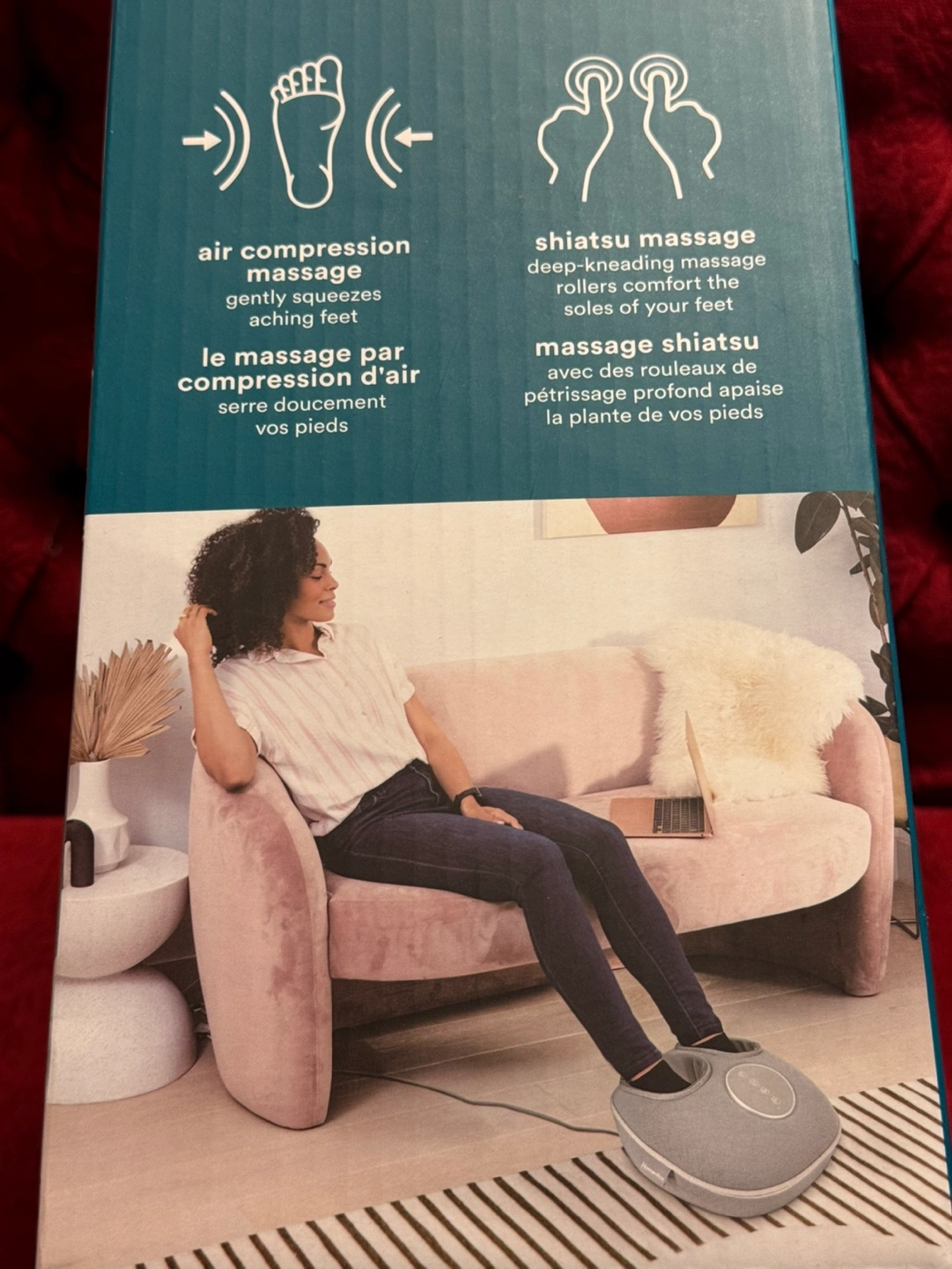 New in box. Features shiatsu massage, air compression, and heat. Adjustable intensity. Includes foot massager and adapter. Removable, washable lining. Premium fabric. Retails for $249.99