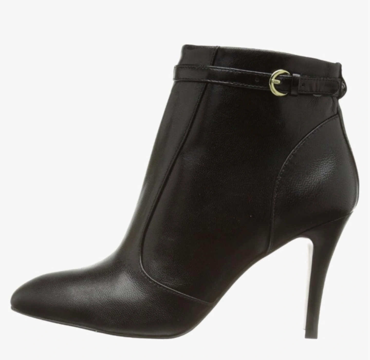 Nine West “Mainstay” black leather ankle booties. Features gold zippers and 3 1/4 inch stiletto heels. Slight wear visible on the lining inside one boot; otherwise in great condition. Very comfortable to wear.