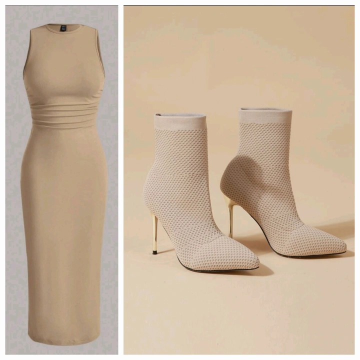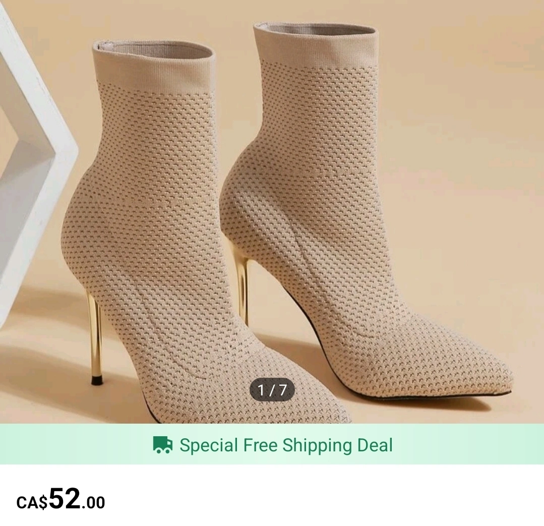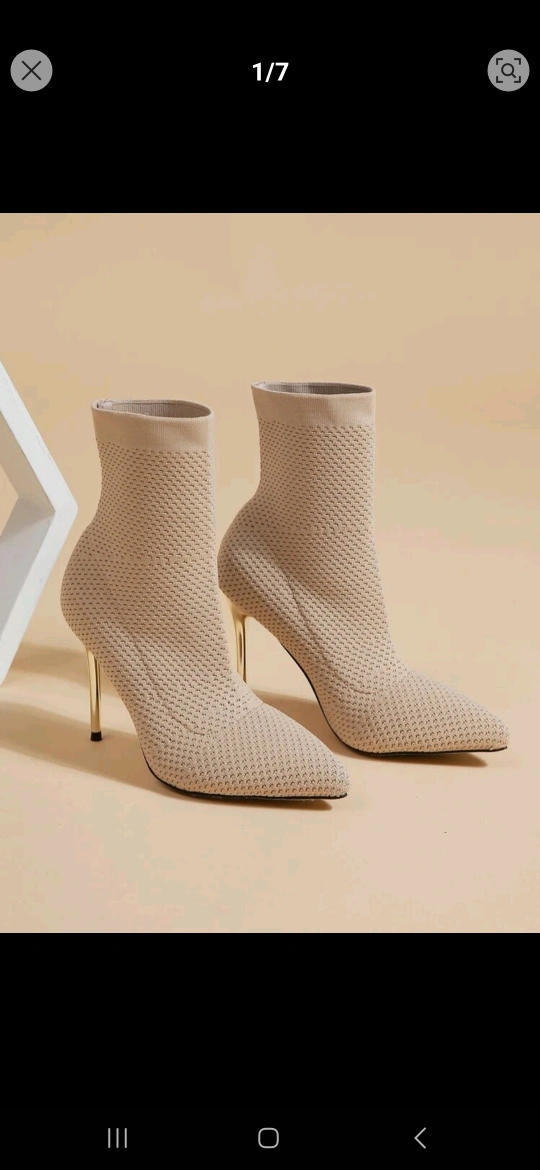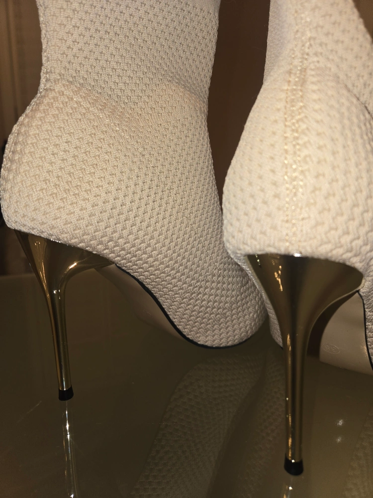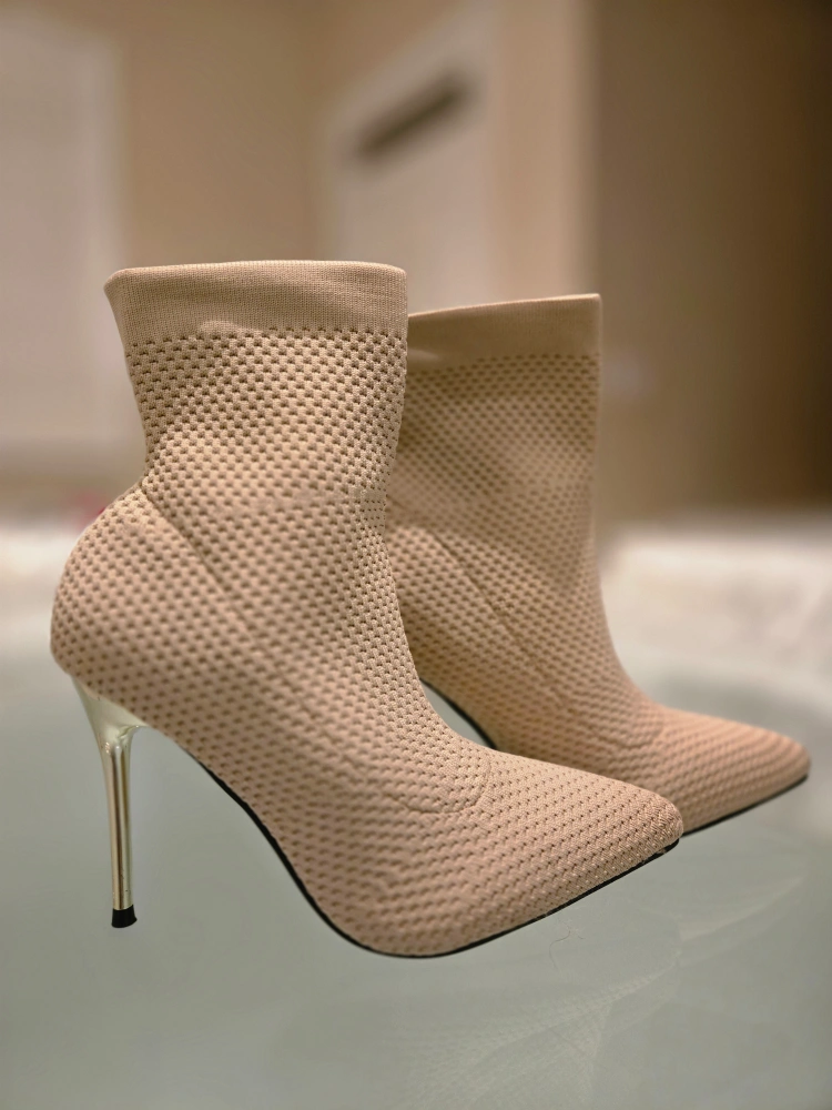 👢Elegant beige knitted ankle boots. Features a pointed toe and stiletto heel. Gold-toned heel detail. Excellent for a night out.