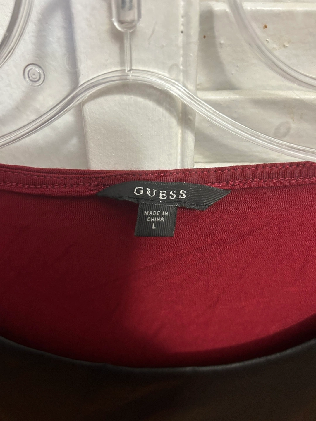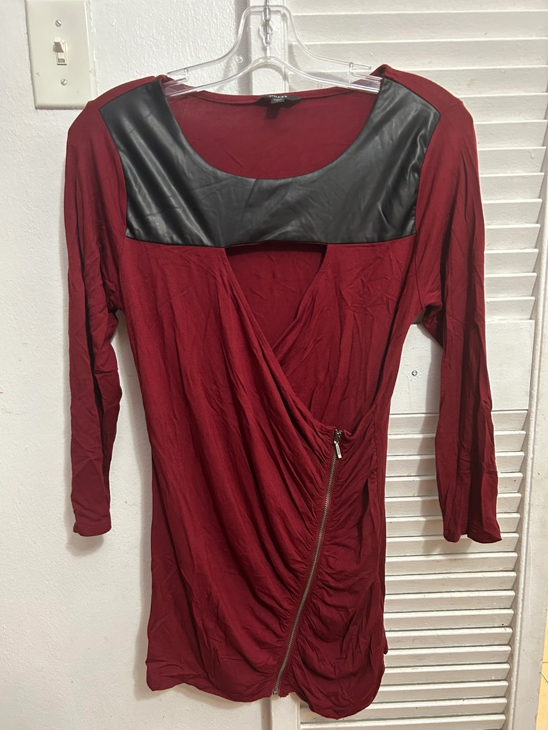 Burgundy dress with black leather accents. Three-quarter sleeves. Side zipper. Size large.