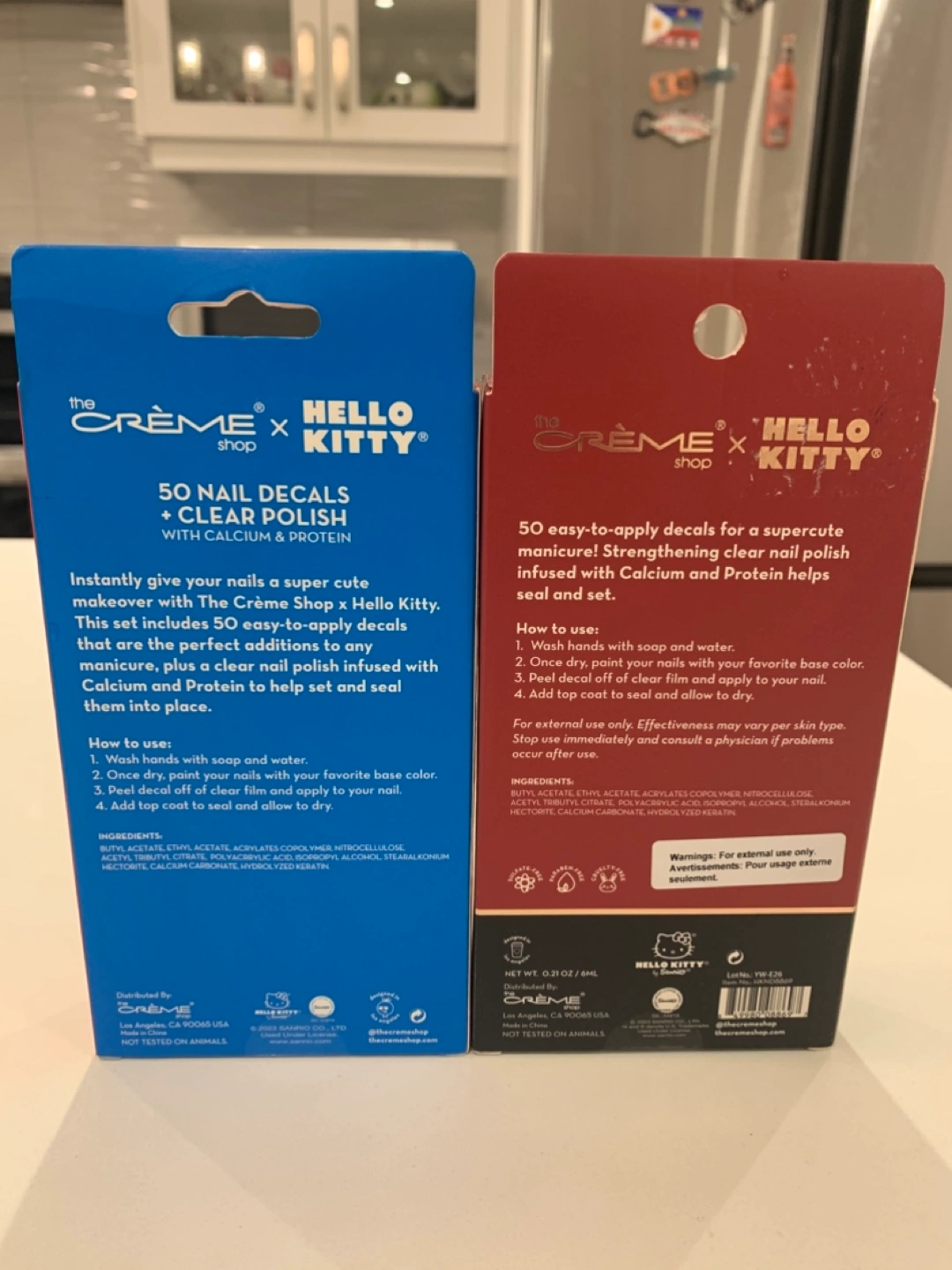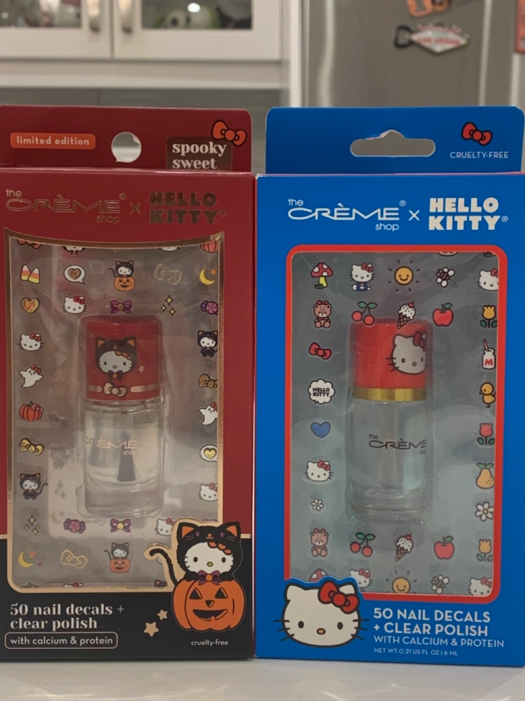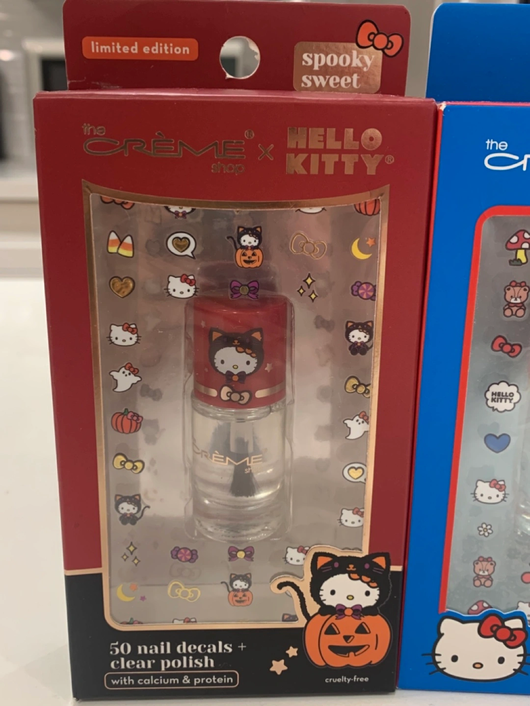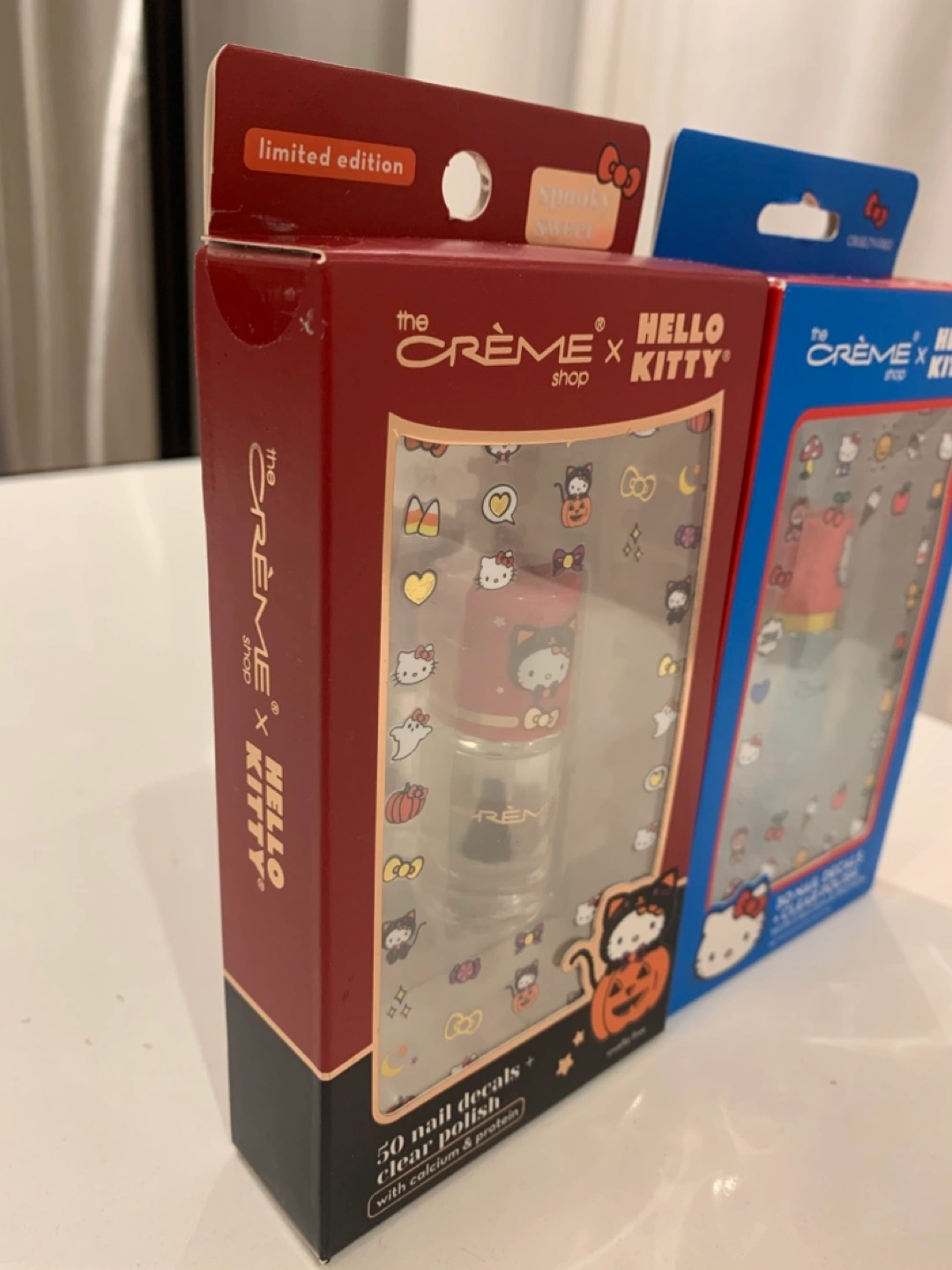 Sealed brand new in box. Sale price is for both! Limited-edition Crème Shop x Hello Kitty nail polish sets. Each includes clear nail polish and 50 nail decals. One set features a spooky sweet Halloween theme, the other a colourful Hello Kitty design. Cruelty-free and infused with calcium & protein.