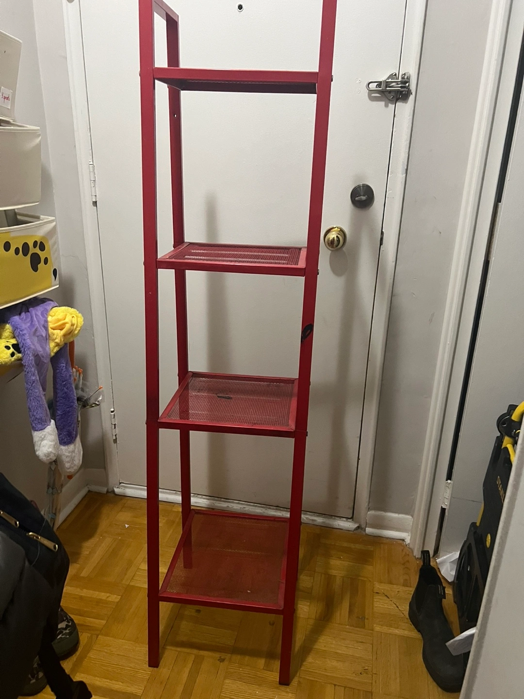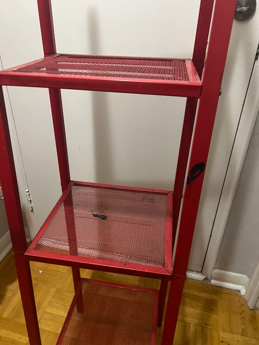 Four-tier shelving unit. Red metal frame. Wire mesh shelves. Good for storage. Some minor blemishes. Pick up only Shipping at buyer’s expense