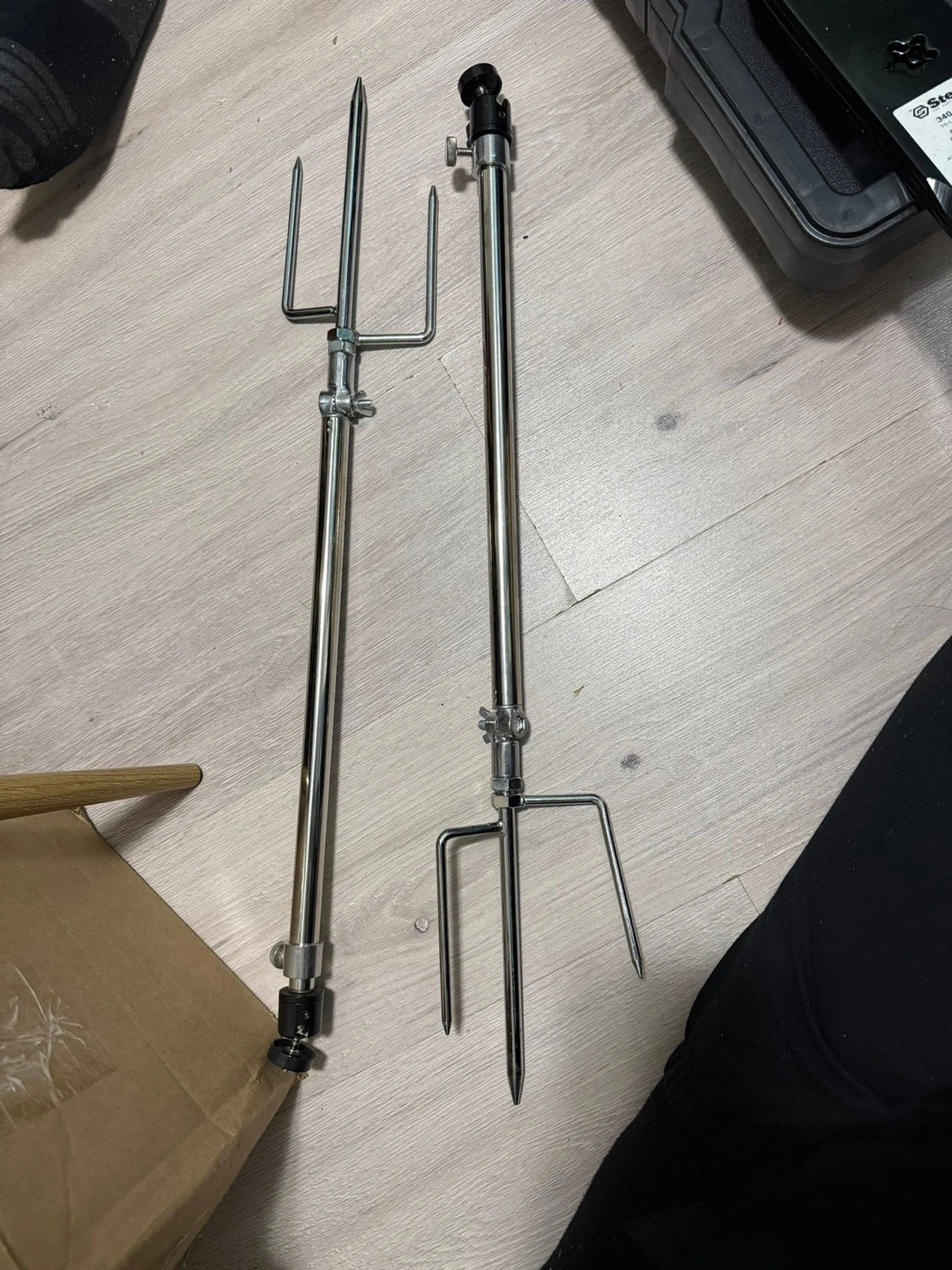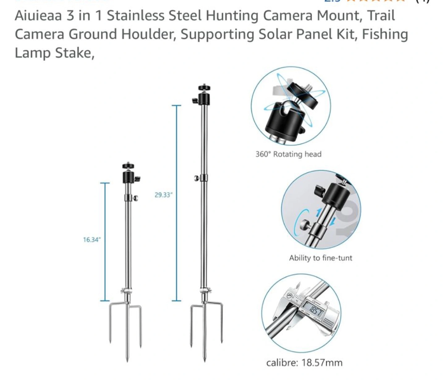 Two adjustable stainless steel ground mounts. Perfect for trail cameras, solar panels, or fishing lamps. Features 360° rotating head and fine-tuning ability. Includes two sizes: 16.34" and 29.33".