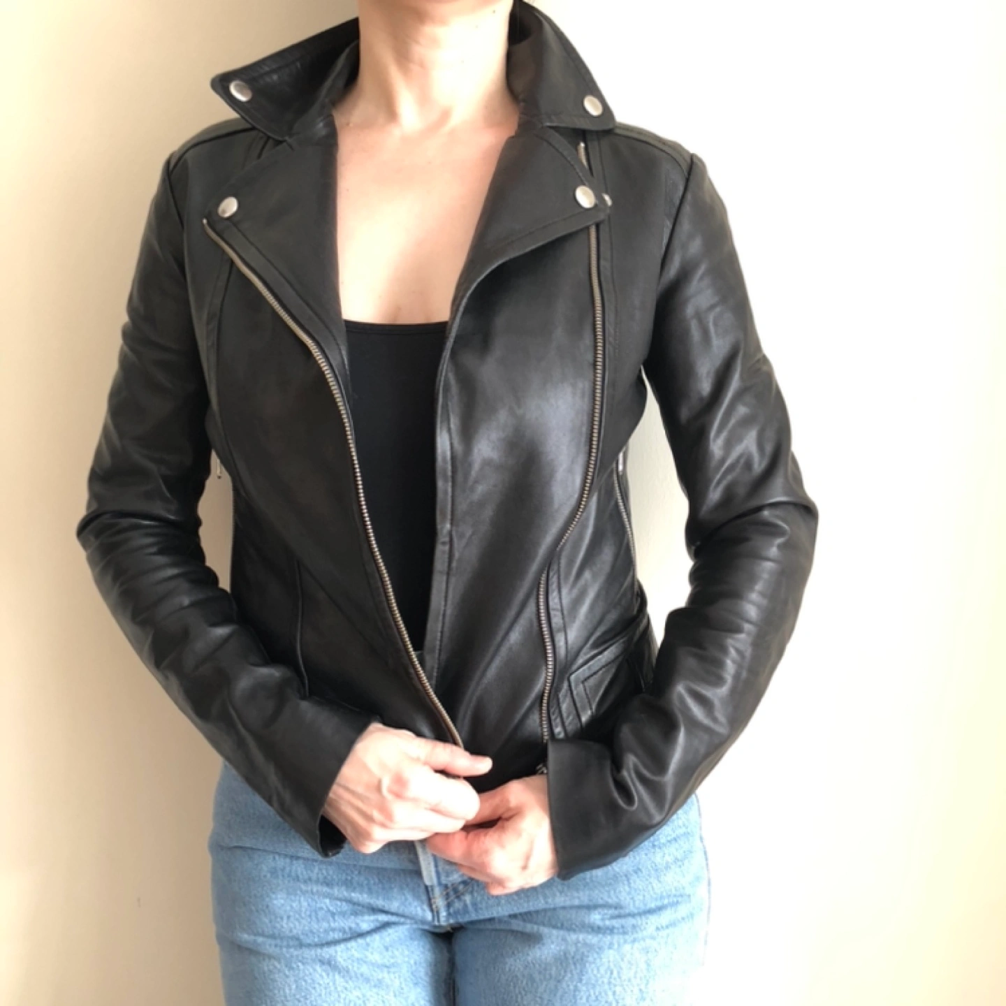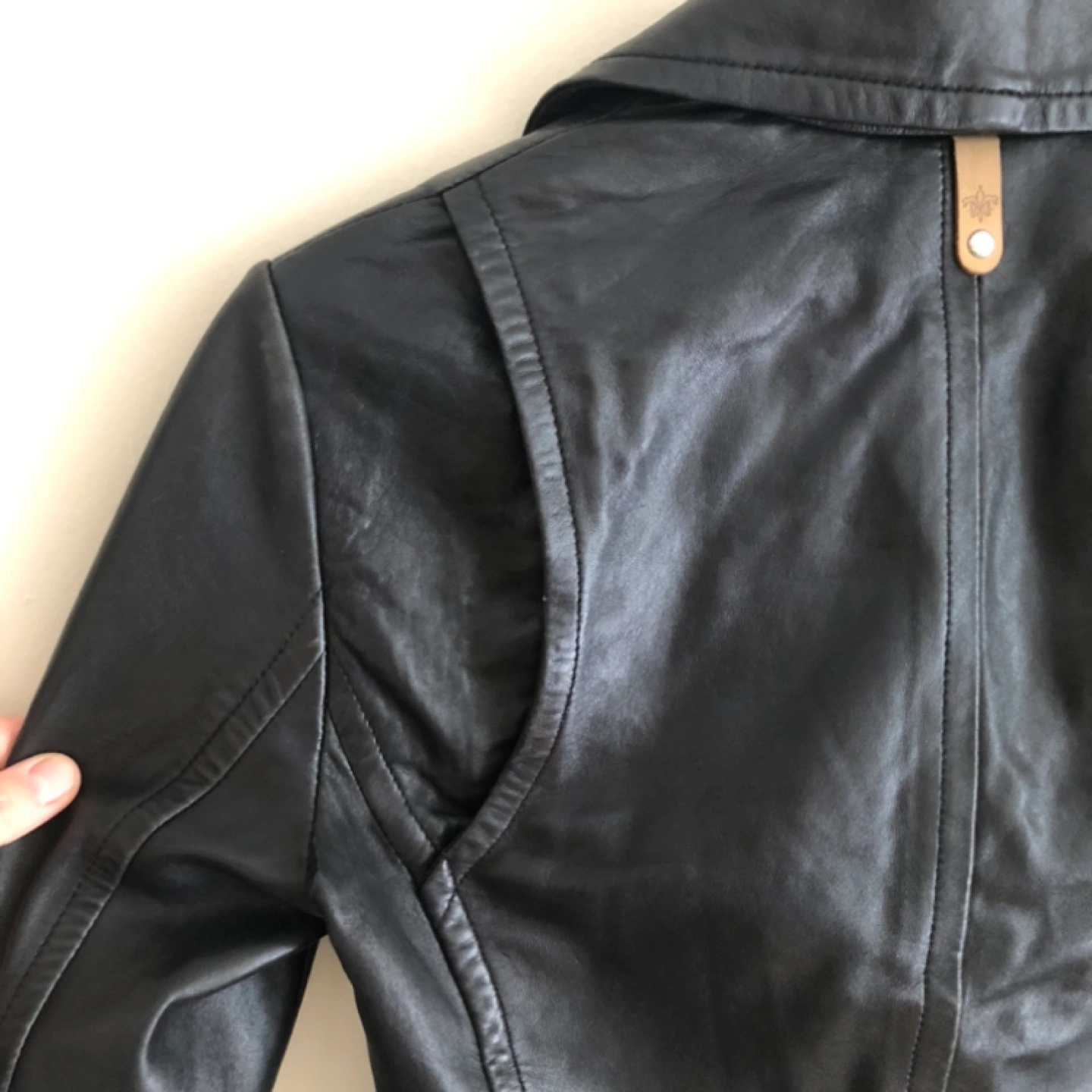 Black lamb skin leather motorcycle jacket by Mackage. Asymmetrical zipper closure. Multiple pockets. Size XXS/TTP. Excellent condition.