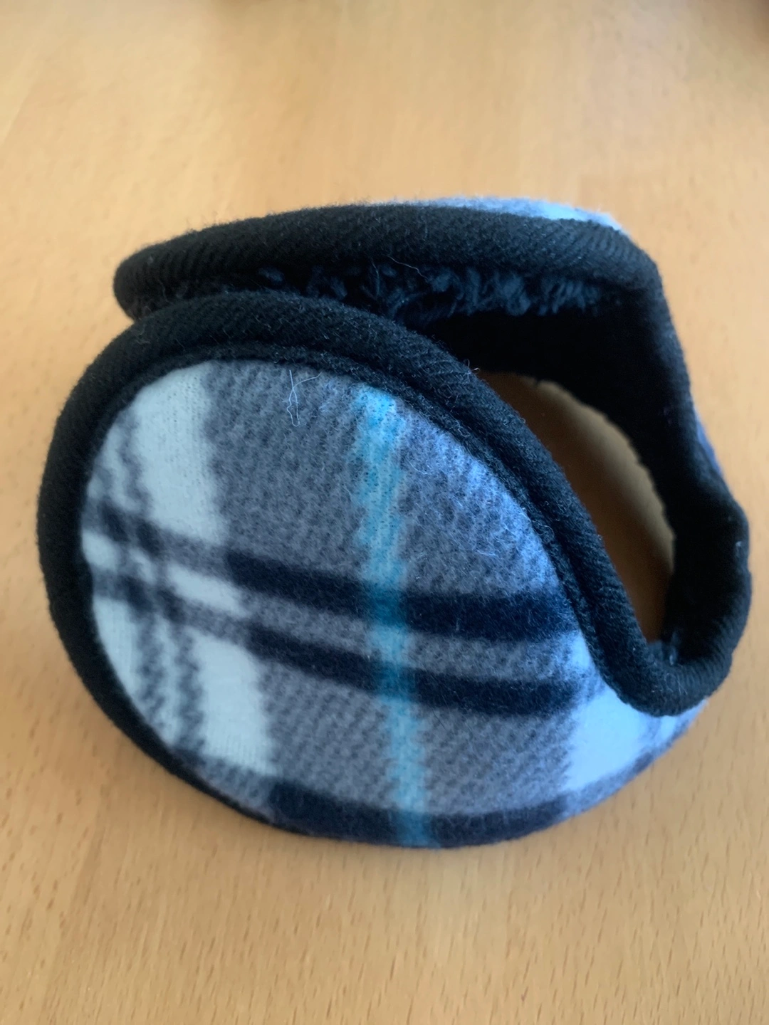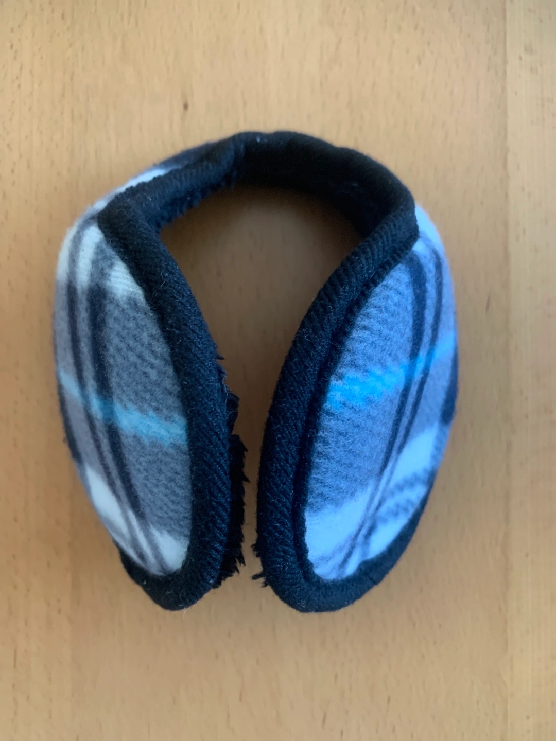 Ear warmers. On the inside black, outside blue and grey plaid. Soft fleece lining. Perfect for winter.