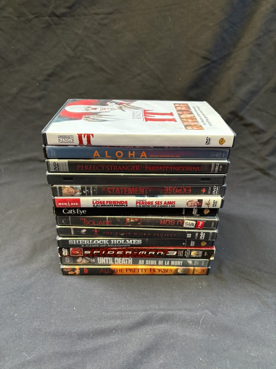 Good condition Collection of 13 DVDs. Titles include IT, Aloha, Perfect Stranger, The Statement, How to Lose Friends & Alienate People, Cat's Eye, The Blair Witch Project, Sherlock Holmes, Spiderman 3, and All the Pretty Horses. Various brands and release dates $5 for ALL Pick up Victoria Park and O’Connor area