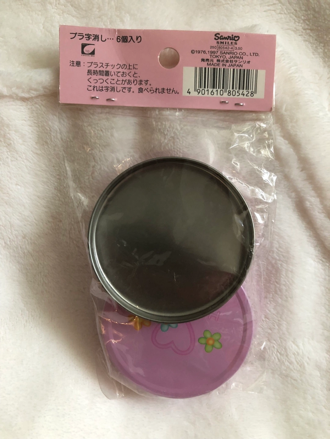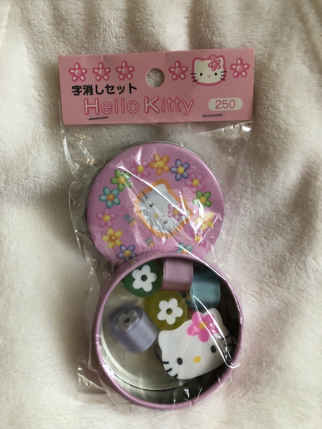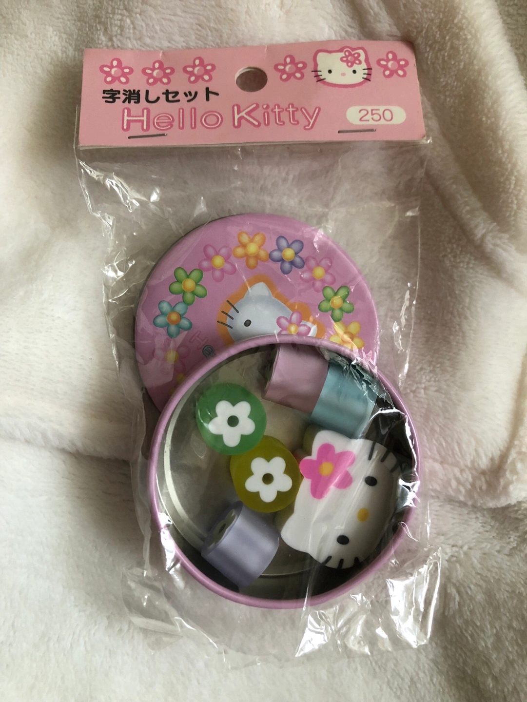 Cute Hello Kitty eraser set. Six erasers in a pink tin. Collectible item. Perfect for stationery lovers. Bought it from Japan