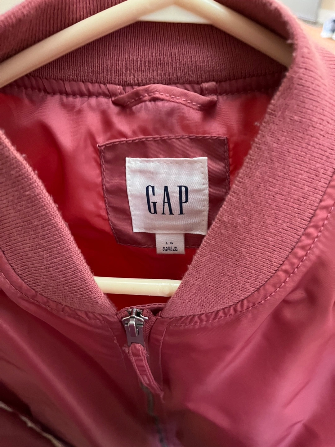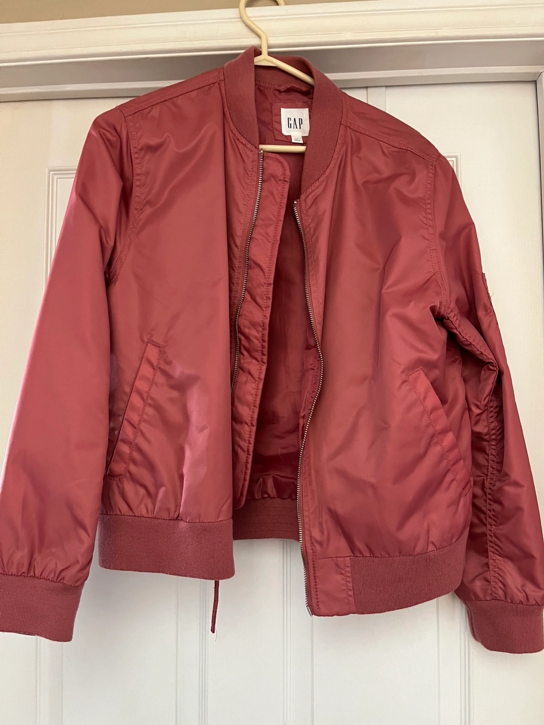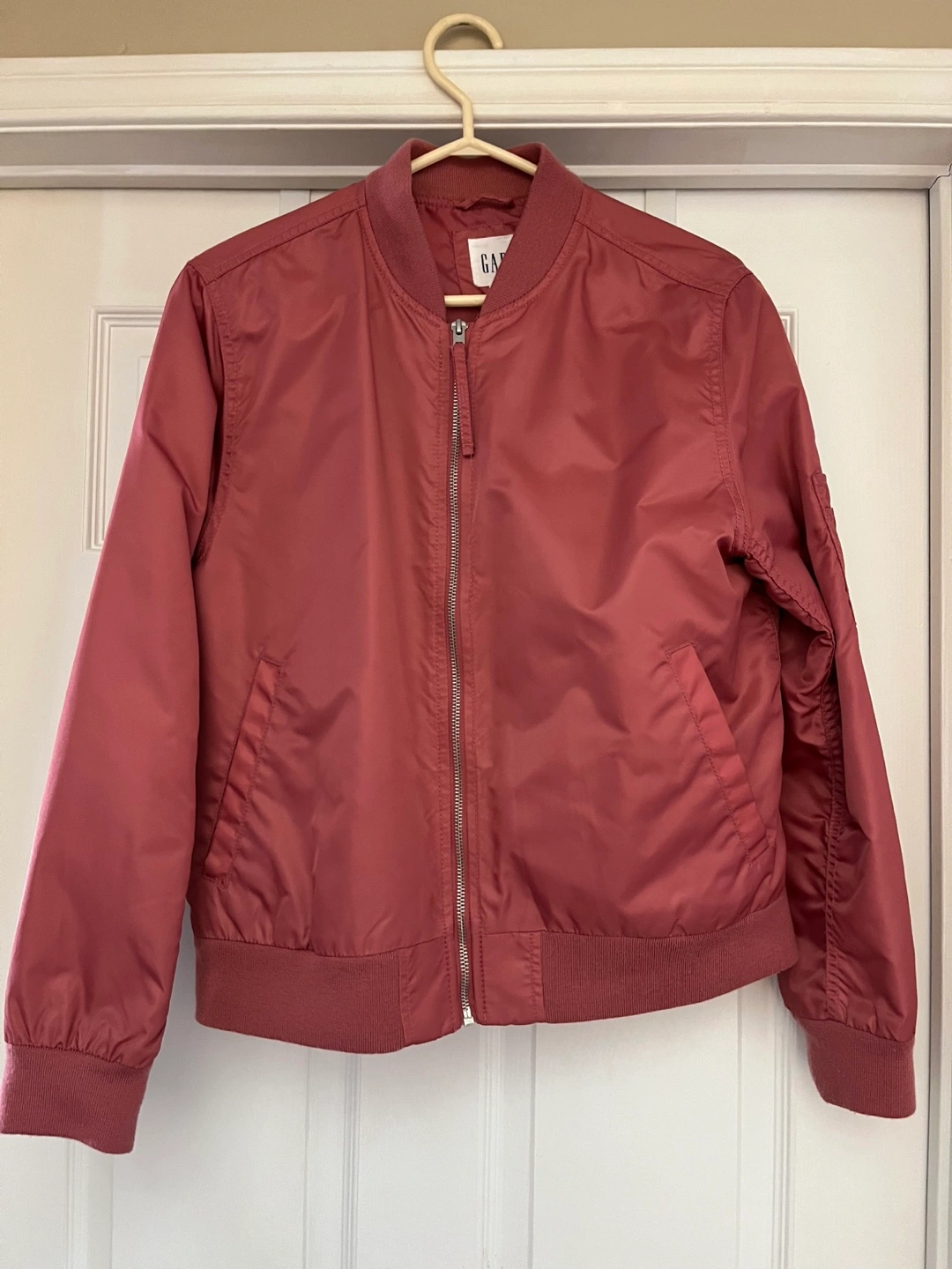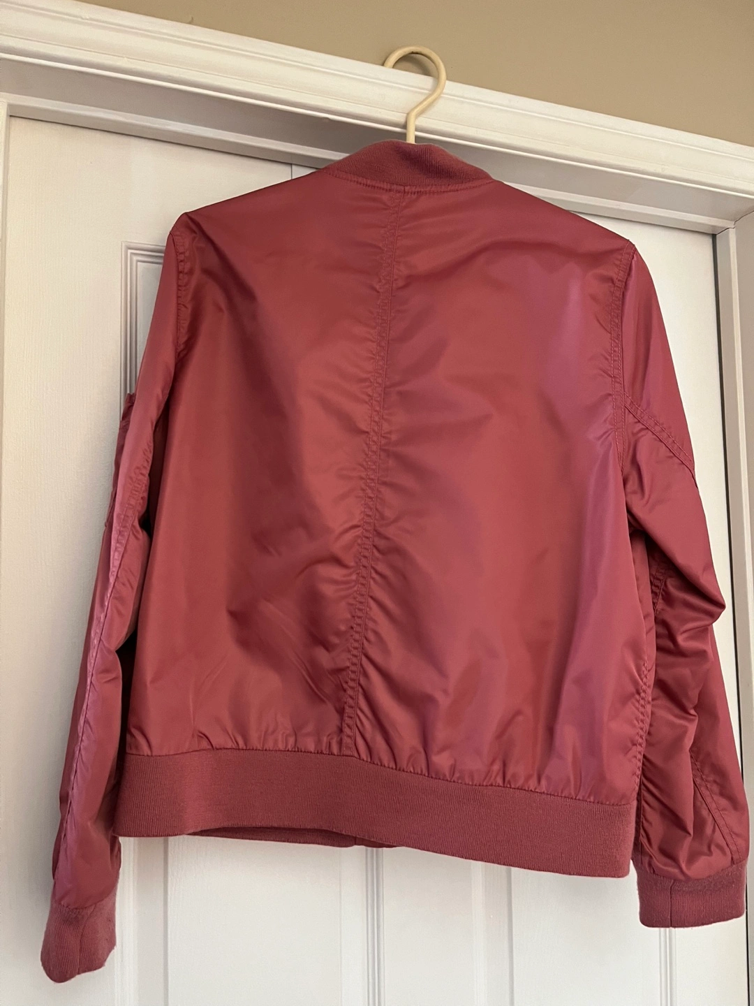 Women's size large bomber jacket. Dusty rose colour. Zip-up front. Ribbed cuffs and hem. Two front pockets.