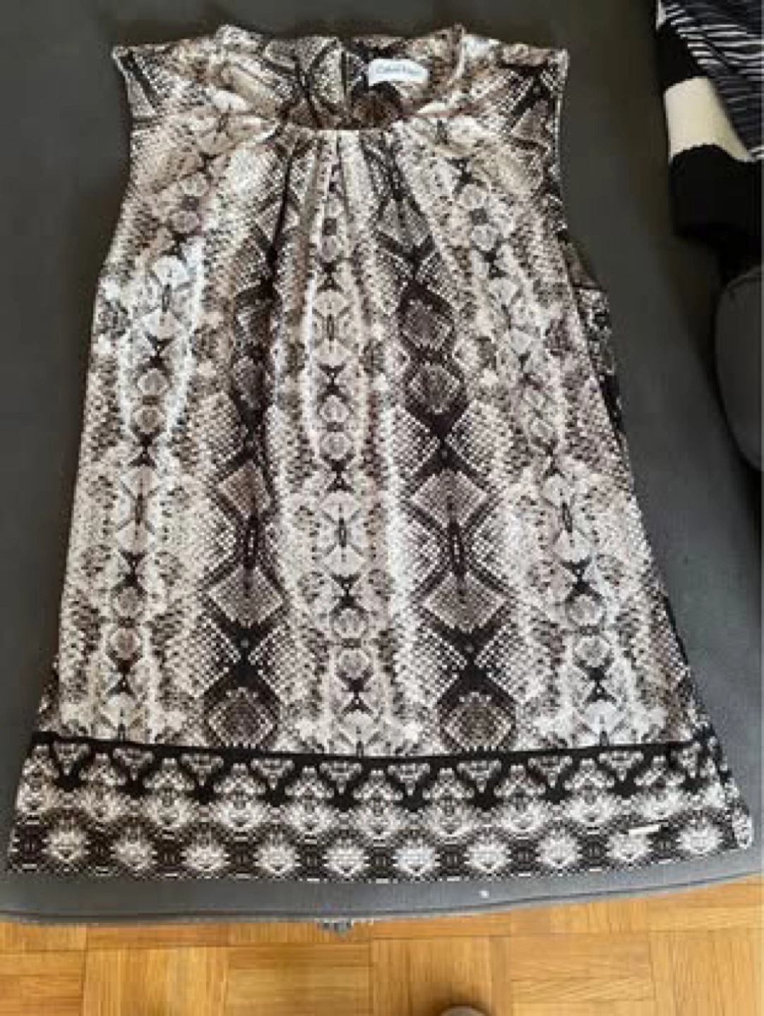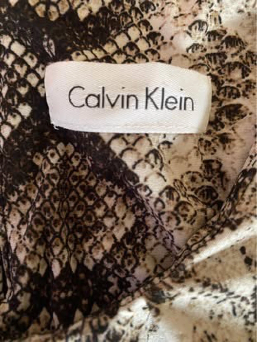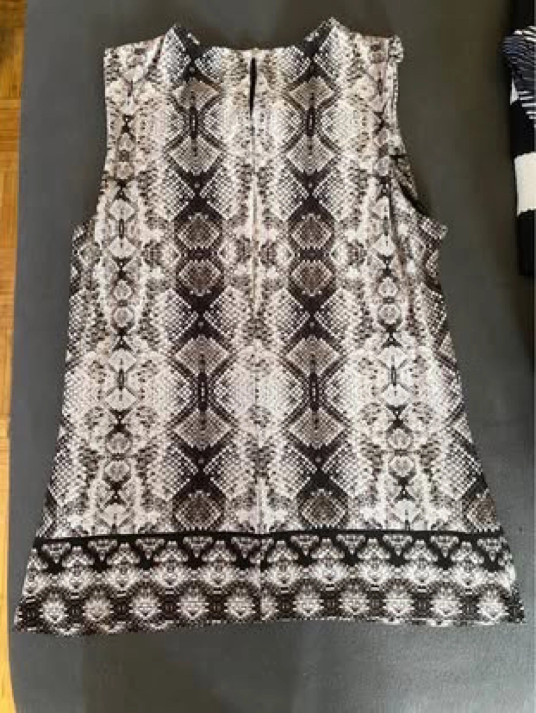 Sleeveless snakeskin print blouse. Rounded neckline with a small pleat at the front. Button closure at the back.