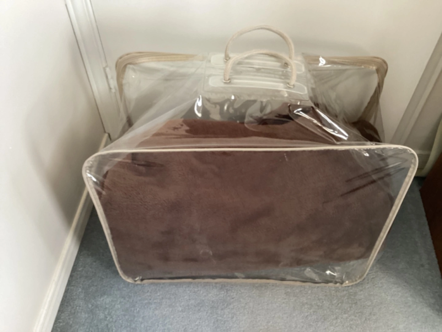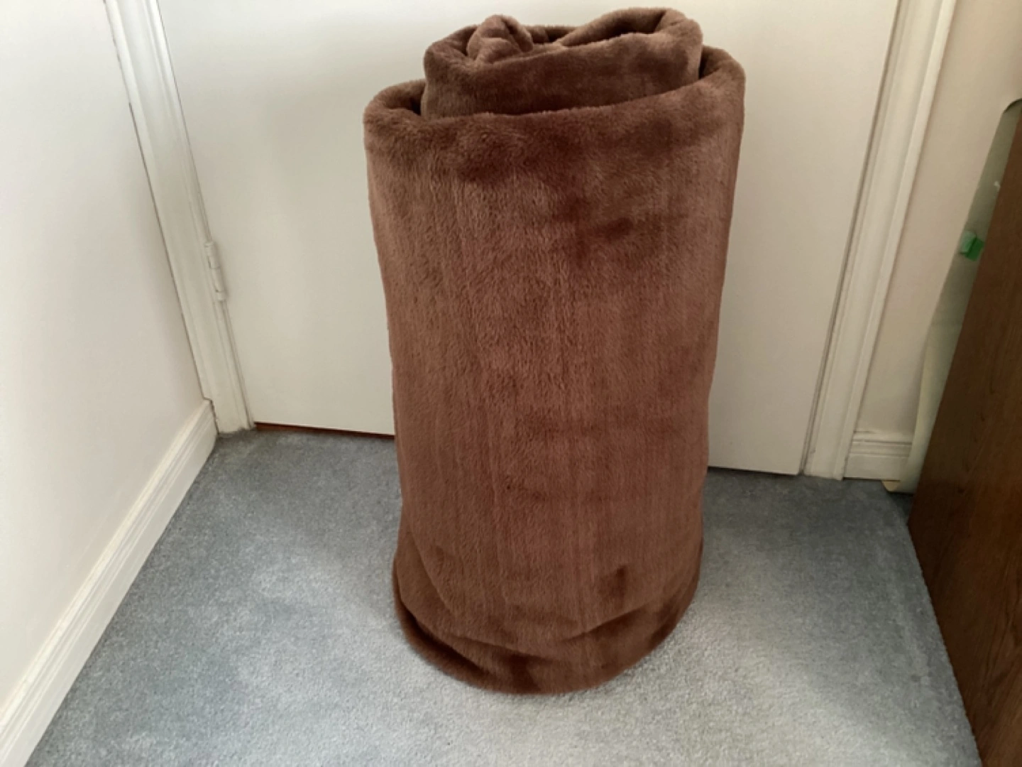 Soft and cozy brown thick blanket. Rolled and stored in a clear plastic carrying bag with handles. Perfect for snuggling on the couch or bed.