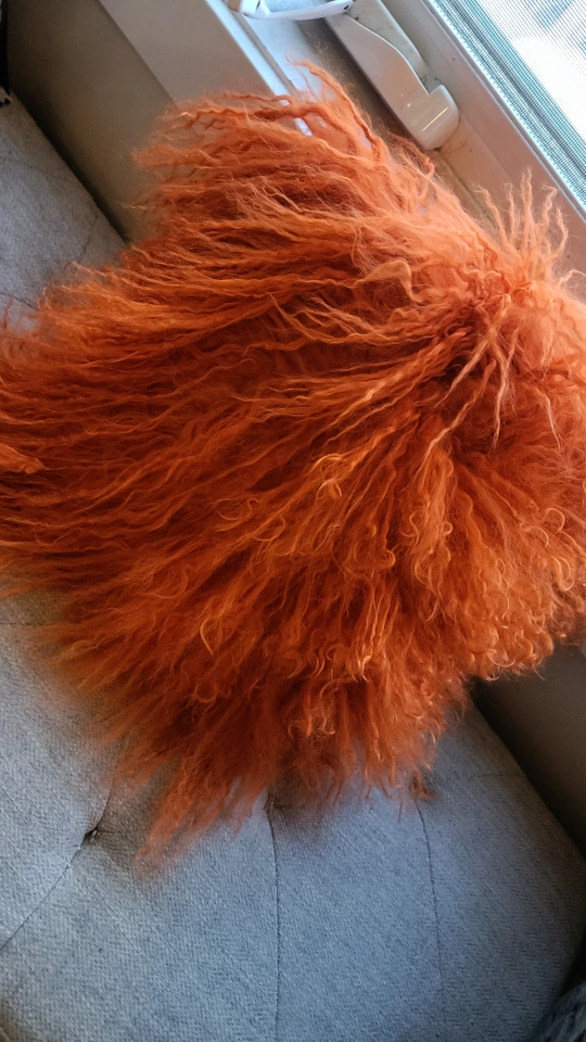 Decorative pillow. Features a long, fluffy burnt orange shag (real) fur exterior. Hidden zipper closure. Square shape. Perfect for boho-chic decor