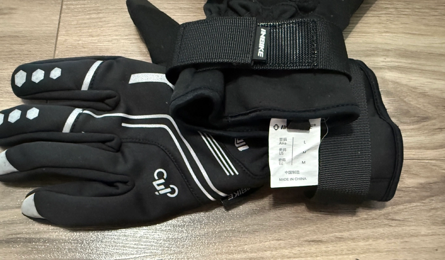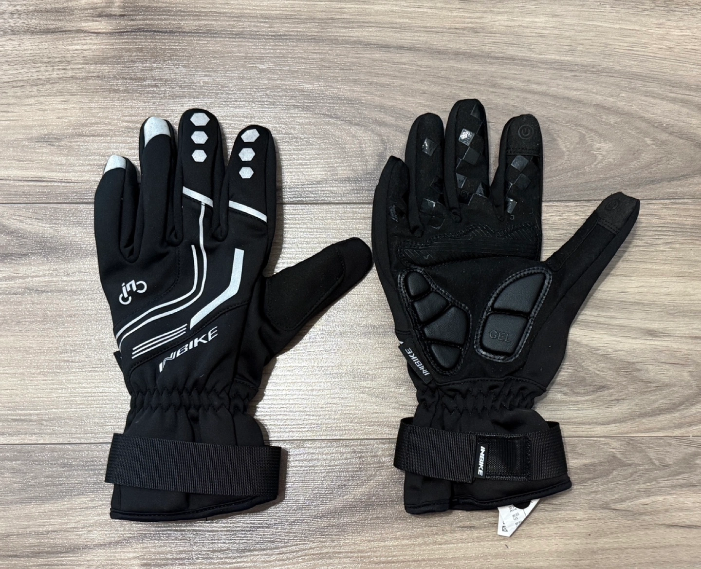 Pair of black cycling gloves. Size Asian: large, US: M. Features padded palms and adjustable wrist straps. Suitable for colder weather. Good condition.