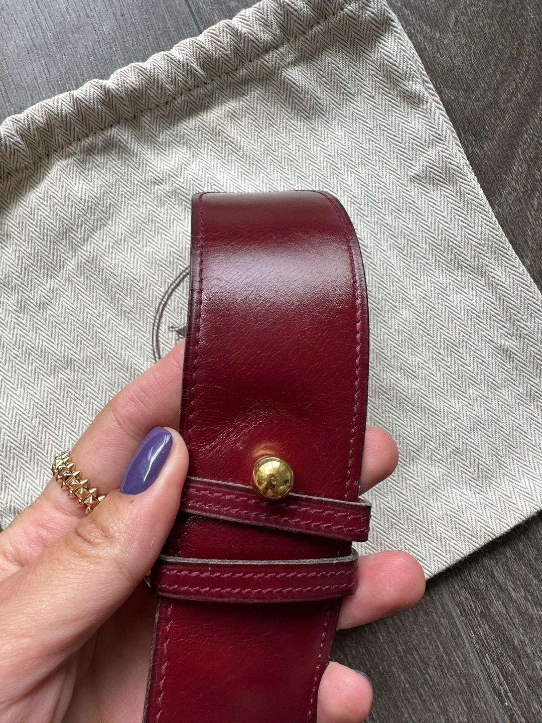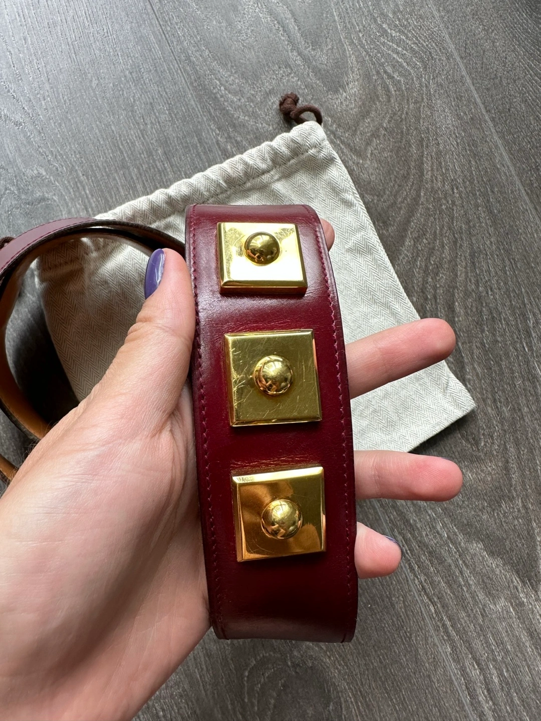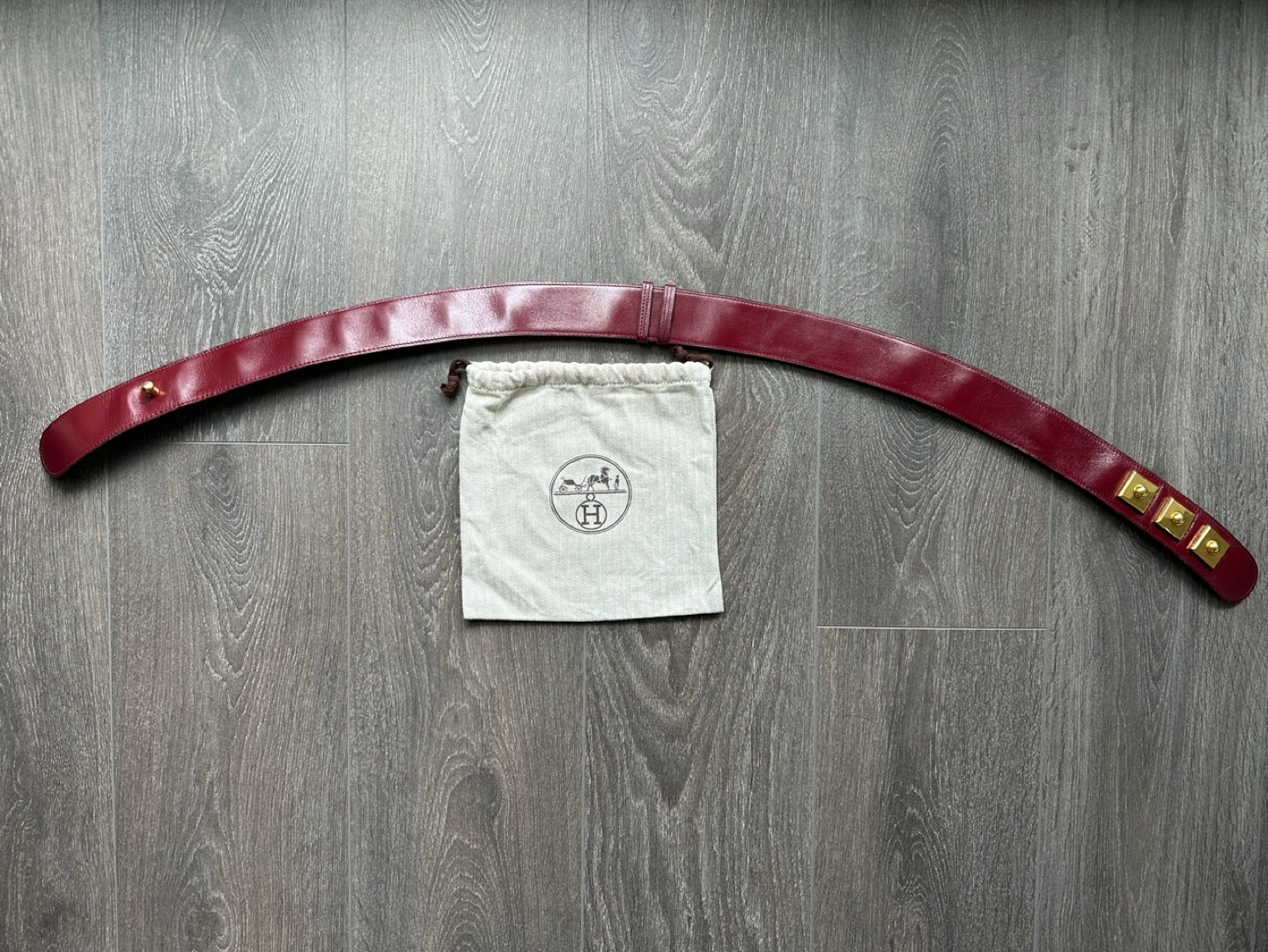 Hermes Red Leather Piano Belt W/ Gold Hardware leather Made In: France Color: Red, gold Hardware: Goldtone Materials: Leather, metal Closure/Opening: Slide through stud closure Overall Condition: Good pre-owned condition with imperfections shown Please ask questions and check all photos for condition
