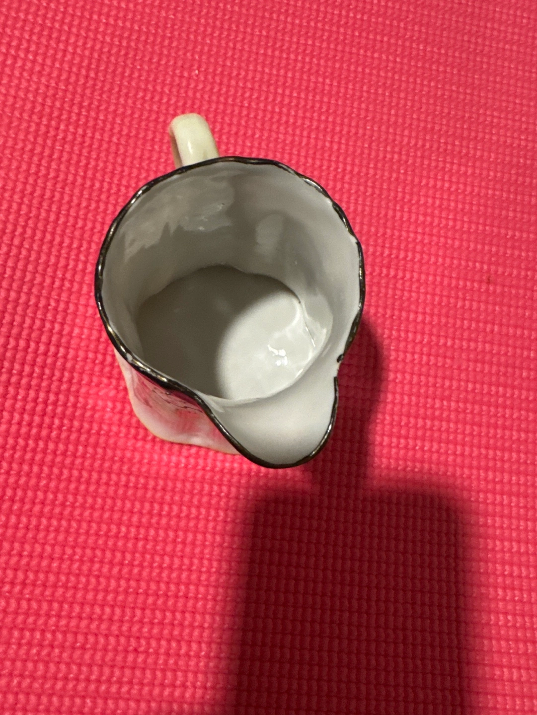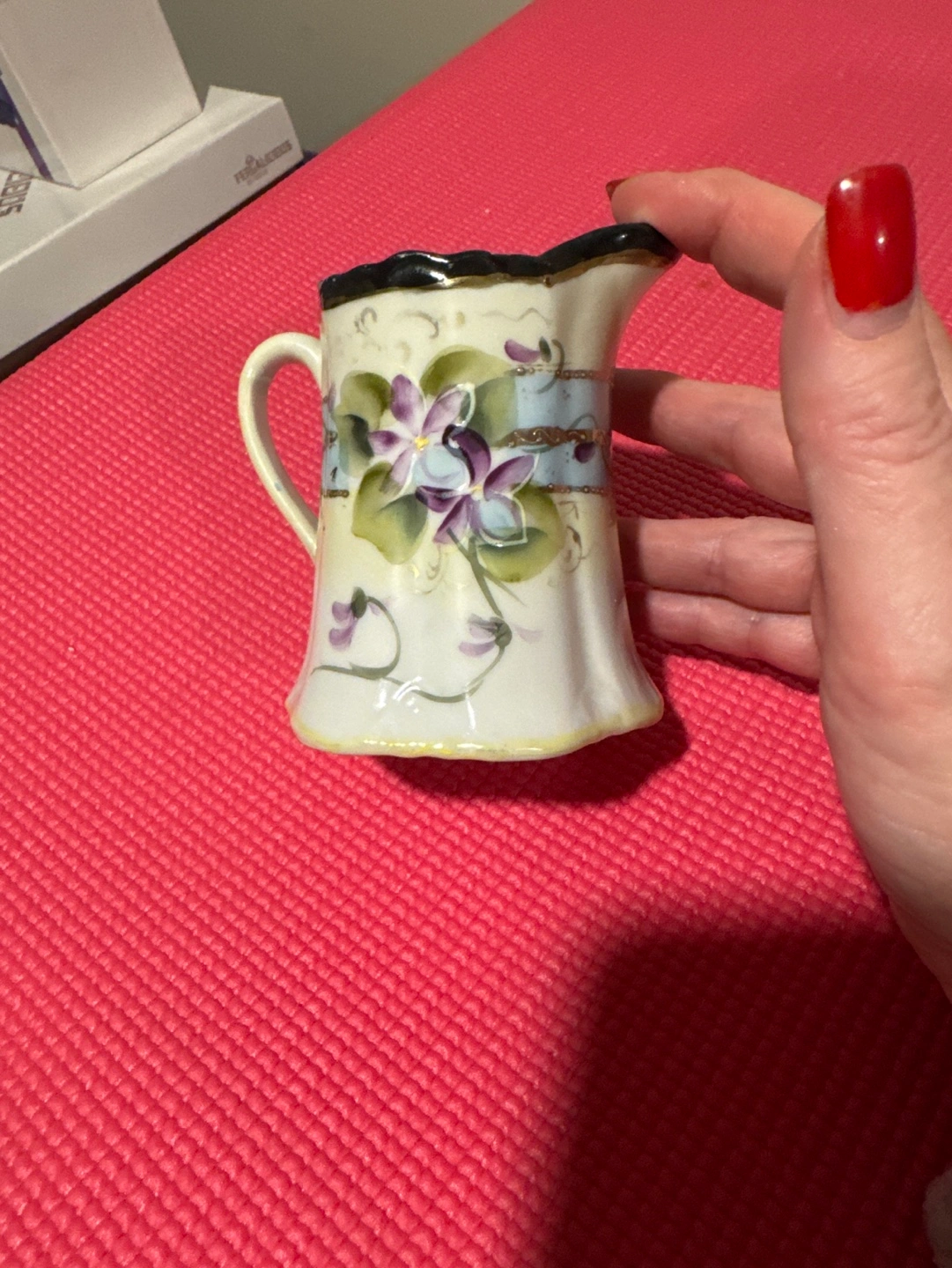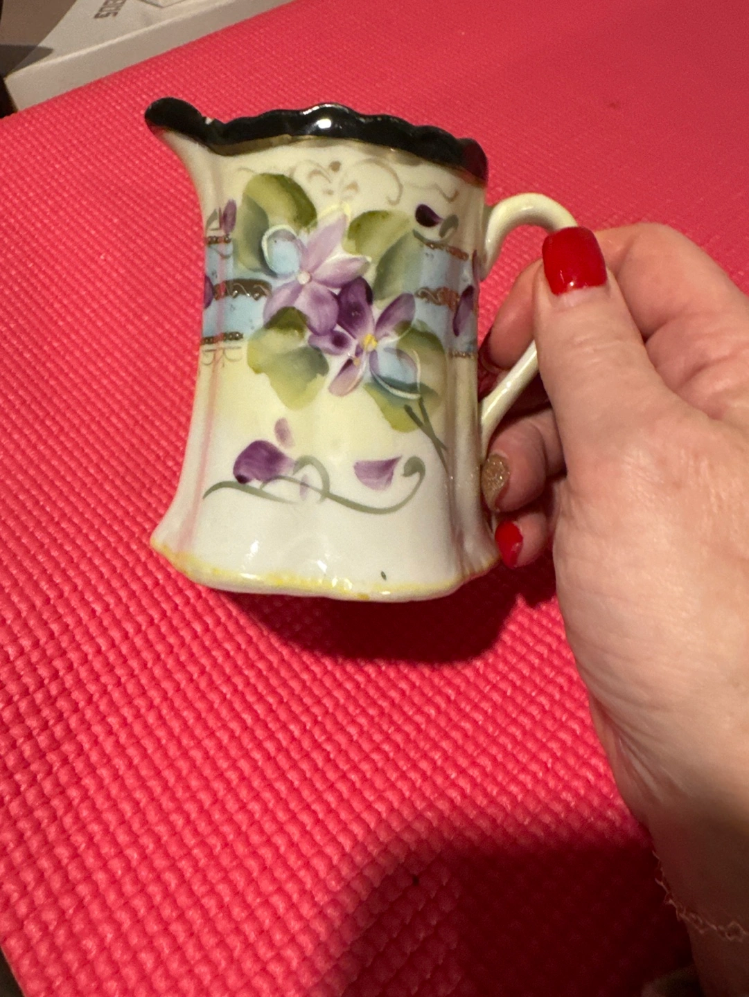 Small vintage porcelain creamer or pitcher. Features hand-painted purple flowers and gold accents. Cream-coloured body with dark rim. Unique and charming piece. Perfect for a tea party or collectible.