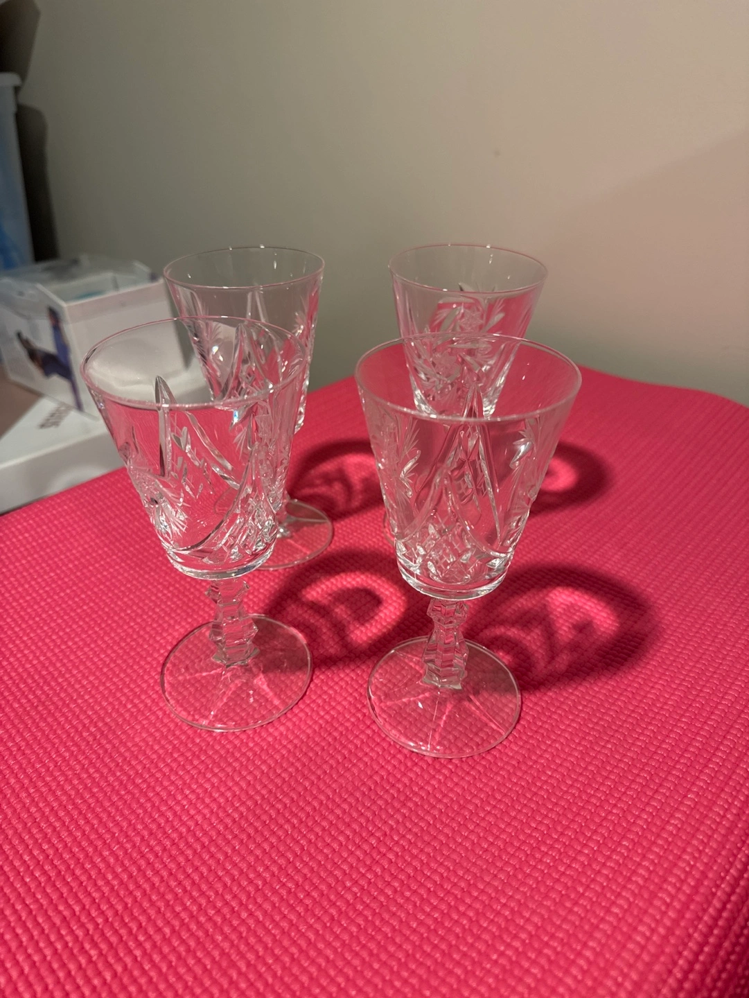 Elegant crystal wine glasses, beautiful cut pattern. Set of four. Perfect for entertaining or adding a touch of elegance to your home. Used once or twice and retail for $15 to $20 each. Selling as a set of 4. Brand new condition.