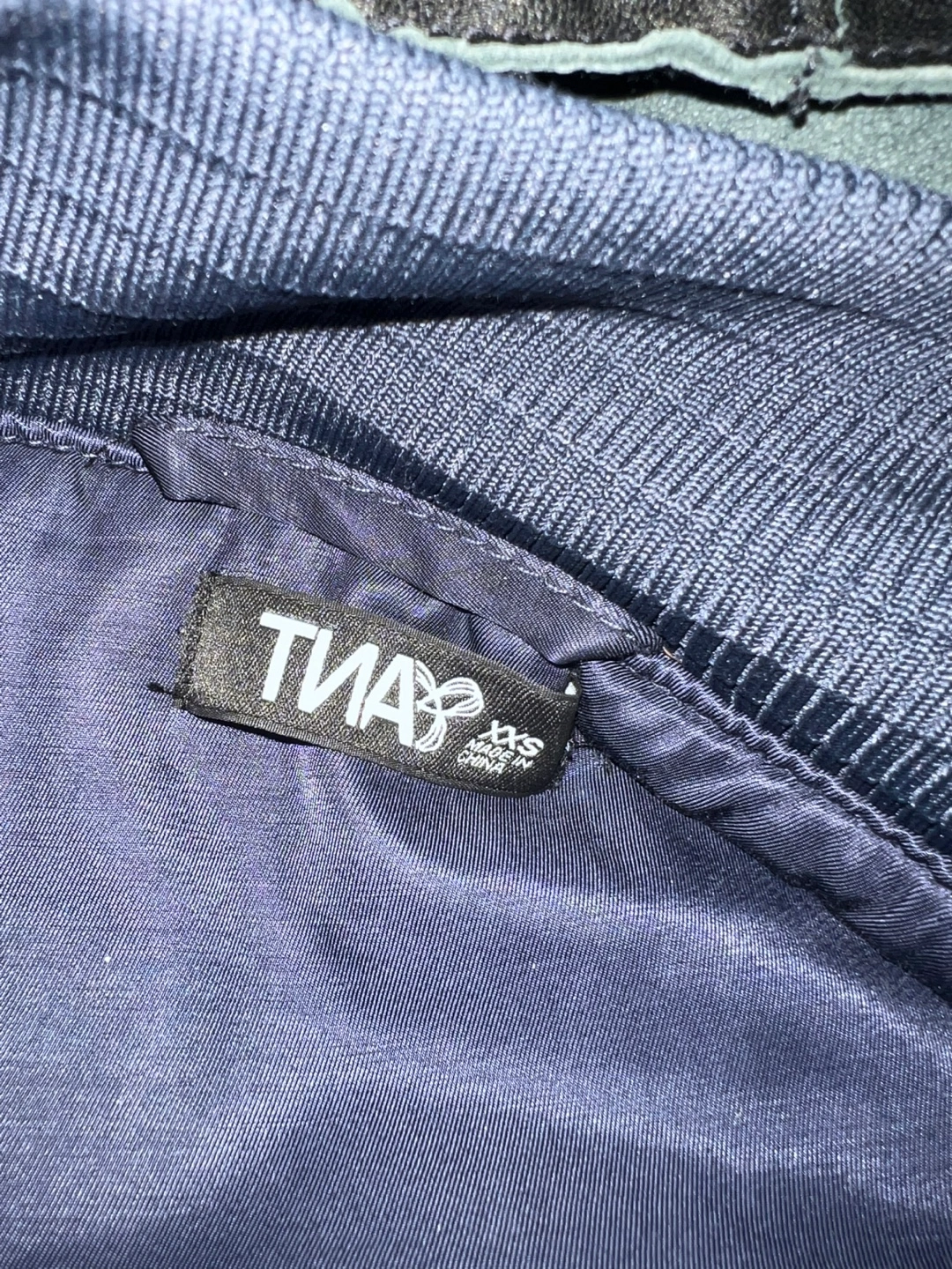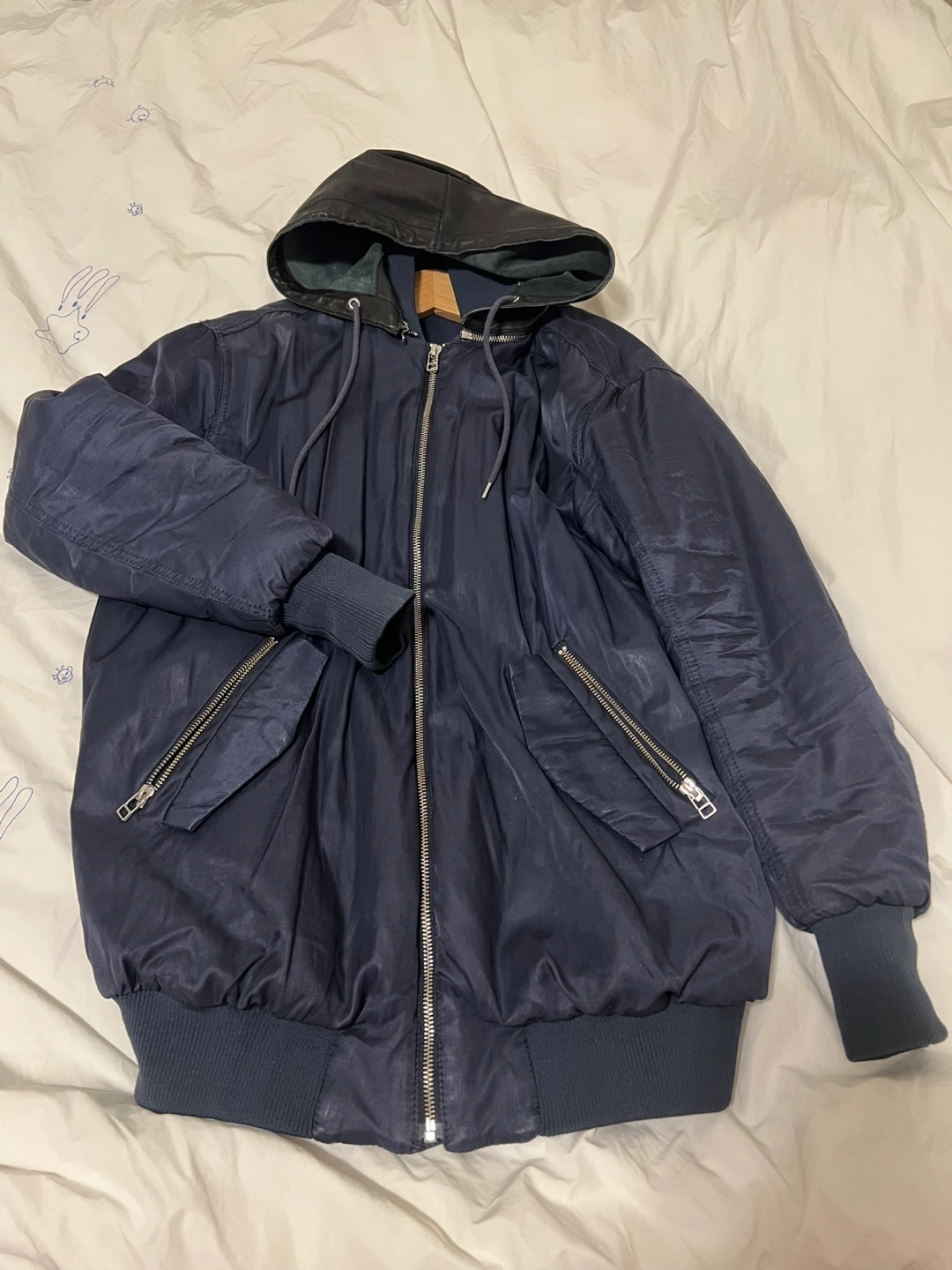 Navy blue bomber jacket with a leather hooded detail, zipper closure, and ribbed cuffs and hem. Two zippered pockets. Size xxs, but fits more like a size small (has an oversized look).