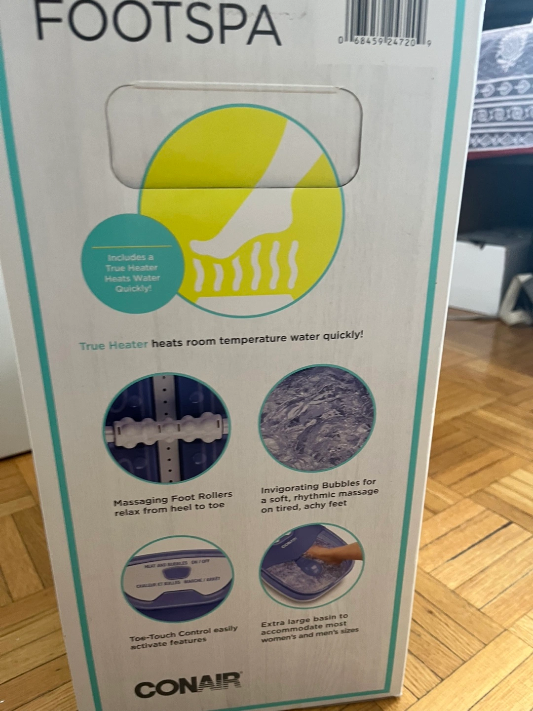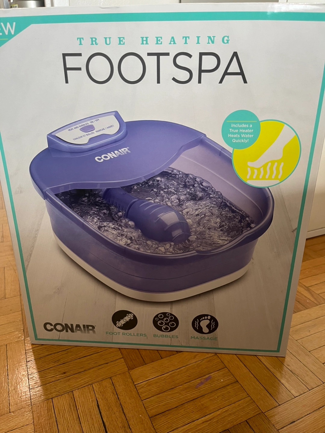 New Conair foot spa. Features true heat, massaging rollers, invigorating bubbles, and extra-large basin. Easy-touch controls. Heats room temperature water quickly.