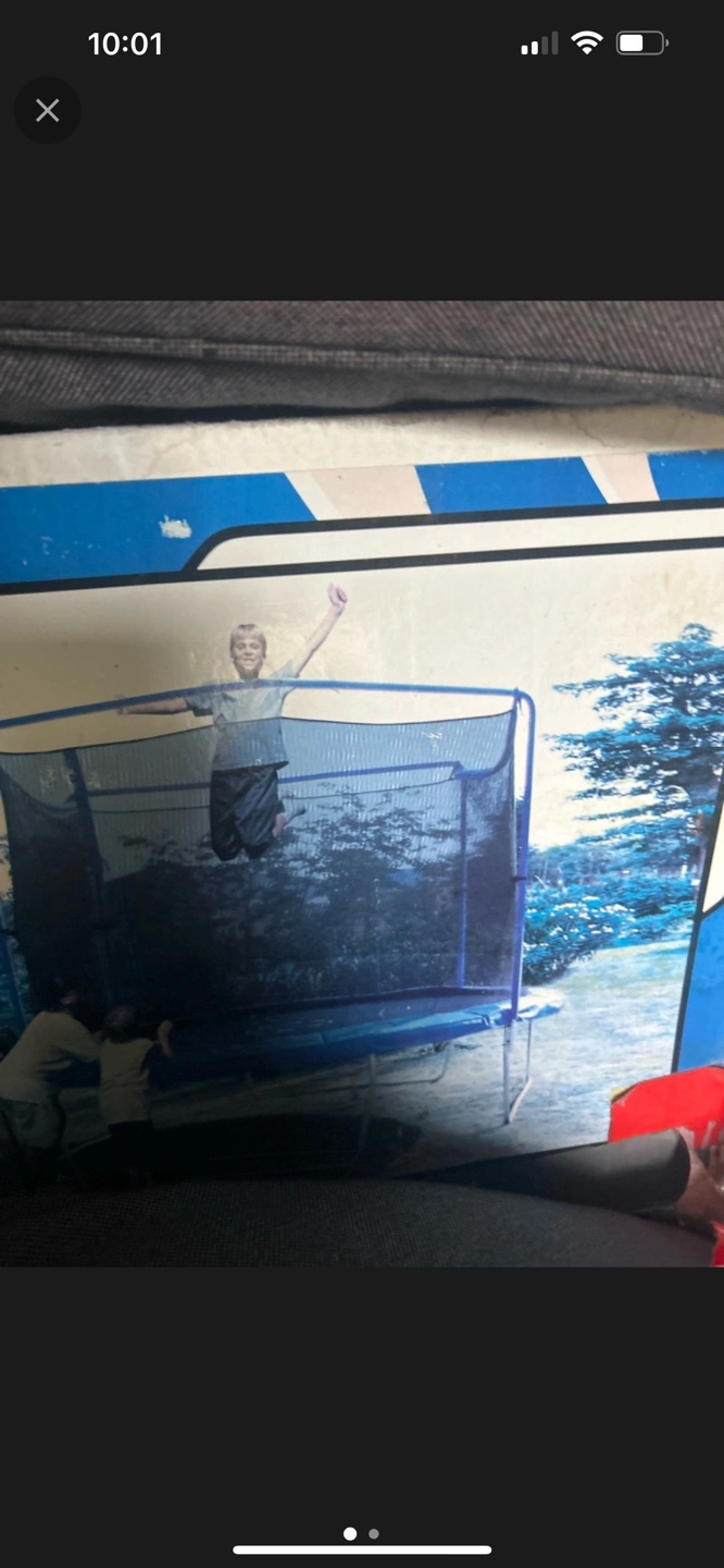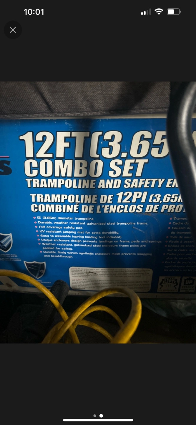 12ft diameter trampoline. Galvanized steel frame. UV resistant jumping mat. Safety enclosure. Durable, finely woven synthetic enclosure mesh prevents snagging. Weather resistant. Extra neting