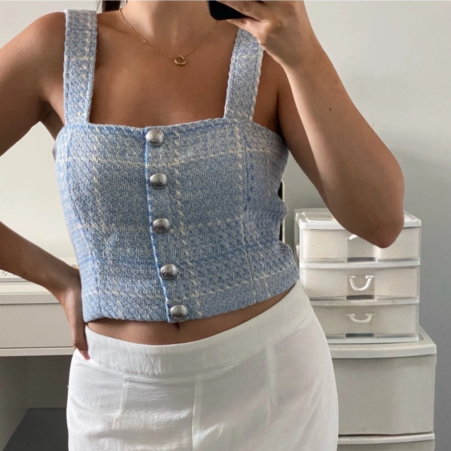•Brand new with tag •Has a side zipper •Length from shoulder to hem: 17” •Pit to pit: 16.5” •Tiny hole by tag - doesn’t go through