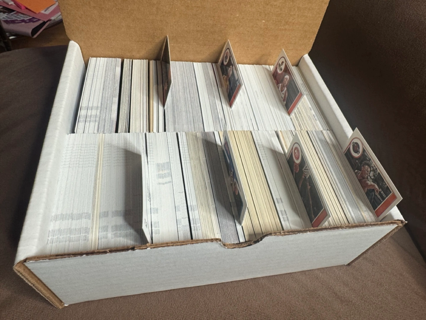 Large box filled with various NBA Hoops basketball trading cards. Many cards visible. Great for collectors or players. (760 cards)