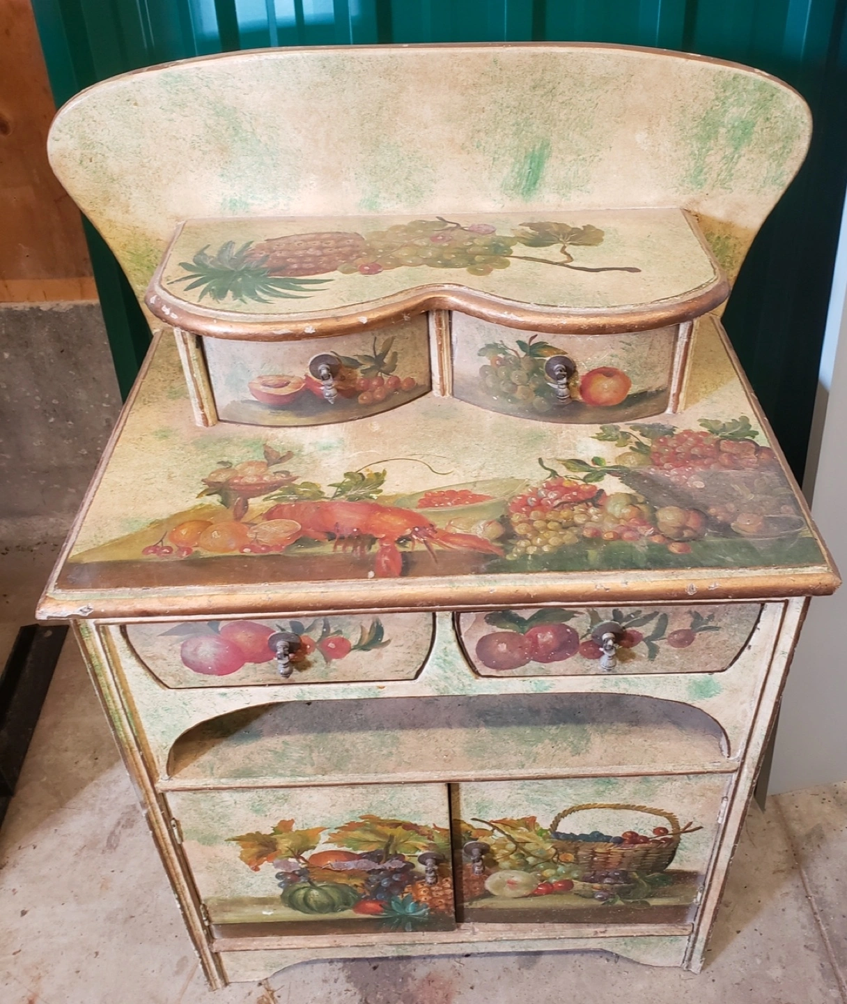 Hand-painted fruit and lobster design. Features multiple drawers and a cabinet. Unique and charming piece. Shows some wear.