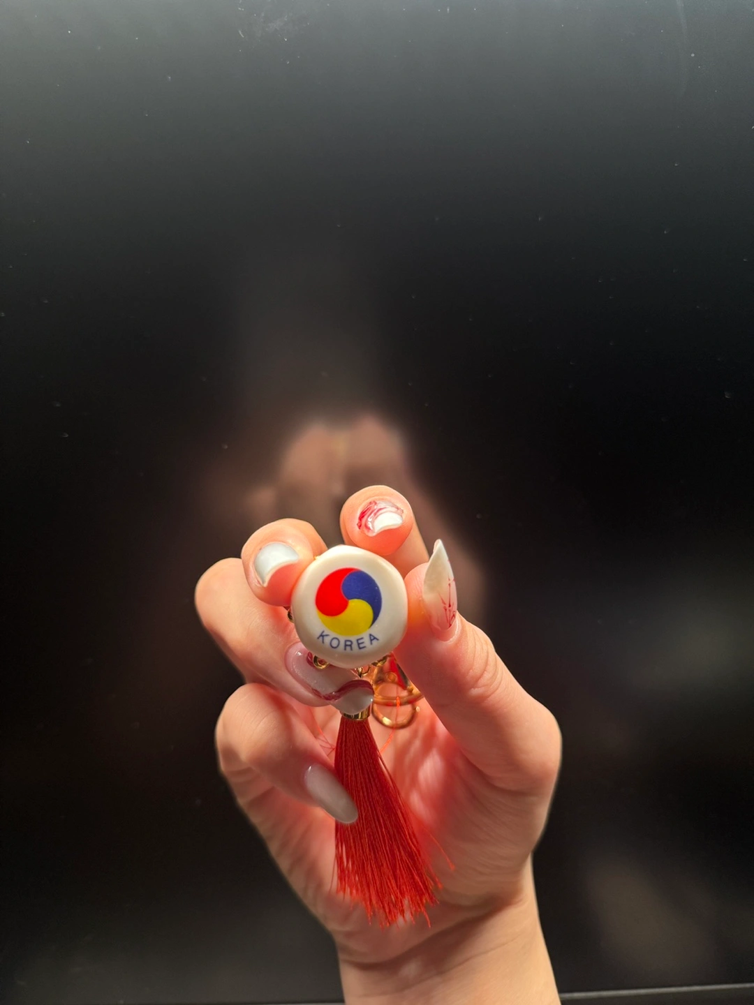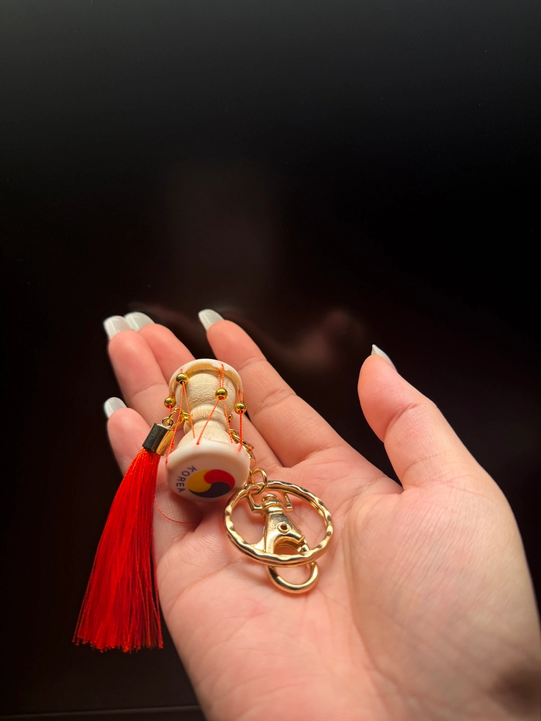 Miniature Buk (Korean drum) keychain. Features a red tassel. Gold-coloured metal keyring. Souvenir from Korea. Unique and cute.