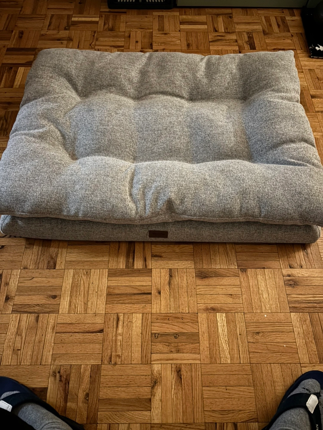 Comfortable pet bed by ‘Martha’; Grey fabric.; size 32 “X 48”; Machine washable. Excellent condition.