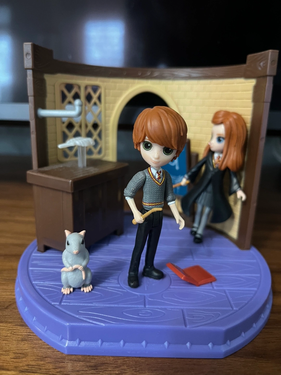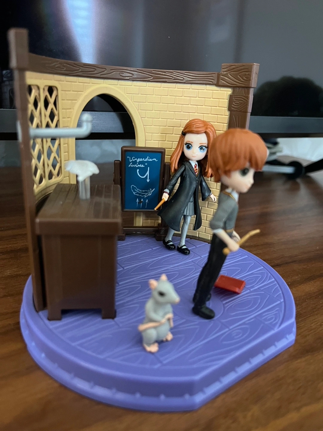 Adorable Harry Potter Minis collectible playset. Features Ron Weasley and Hermione Granger figurines. Includes a miniature Hogwarts classroom setting. Great for Harry Potter fans. Set not in original packaging and in great shape.