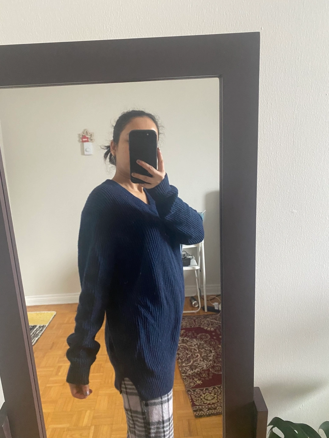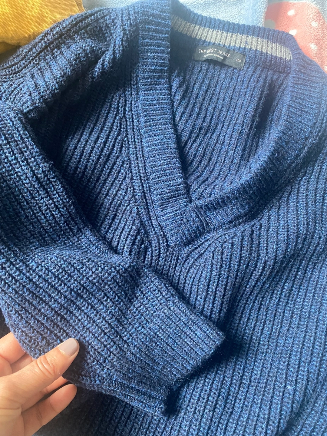 Dark blue oversized v-neck sweater. Ribbed knit. Long sleeves. Relaxed fit. Size 100.