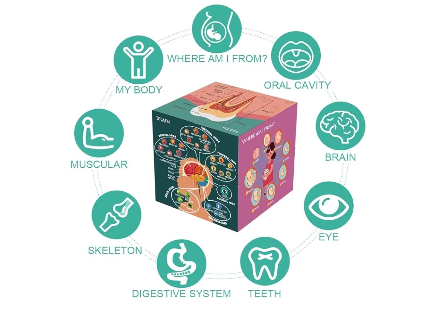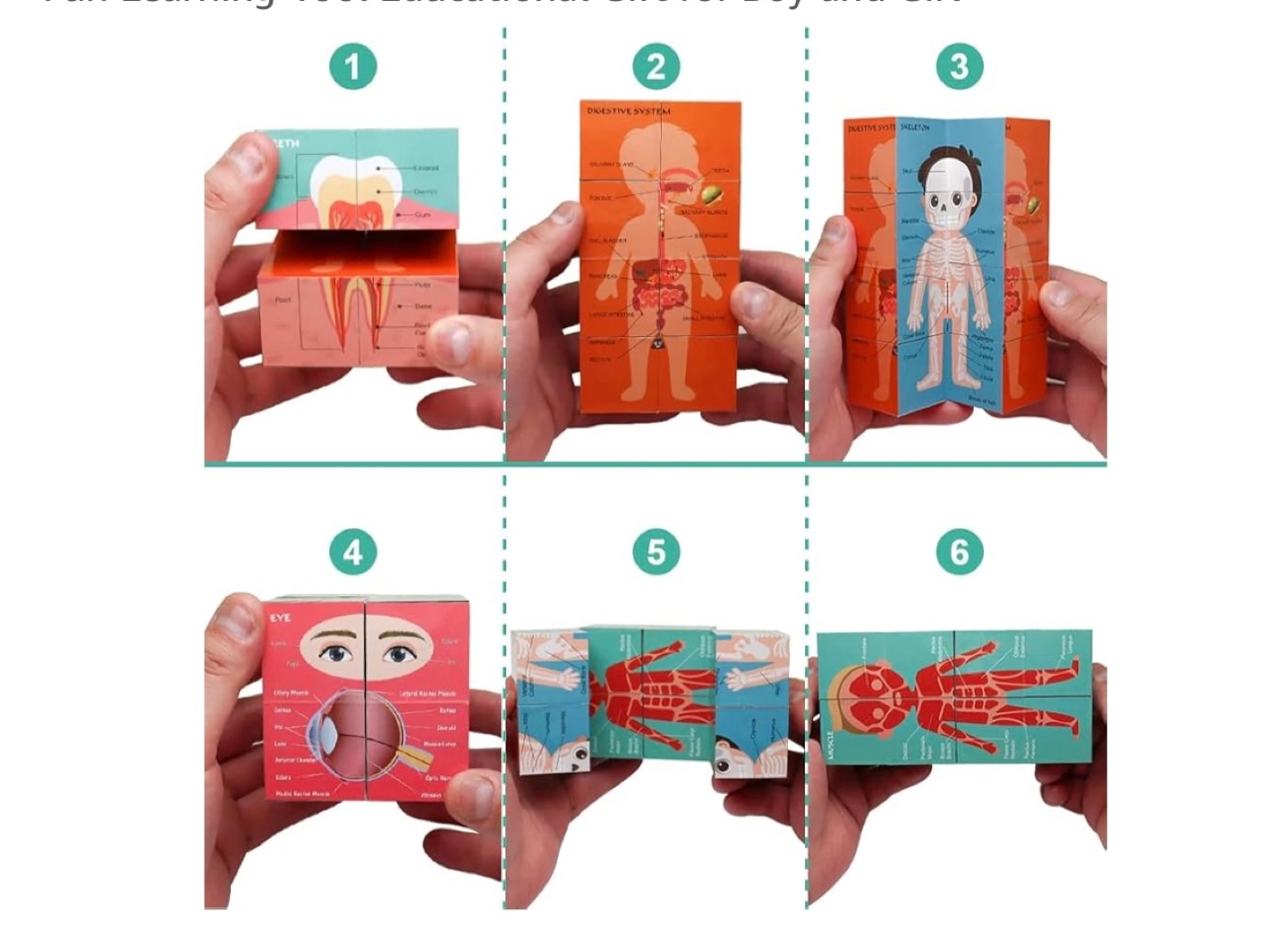 Educational puzzle cubes. Features a cartoon boy and illustrations of major body organs. Great for learning human anatomy.