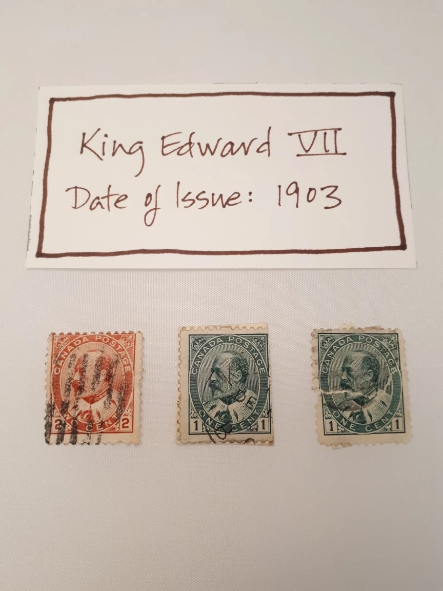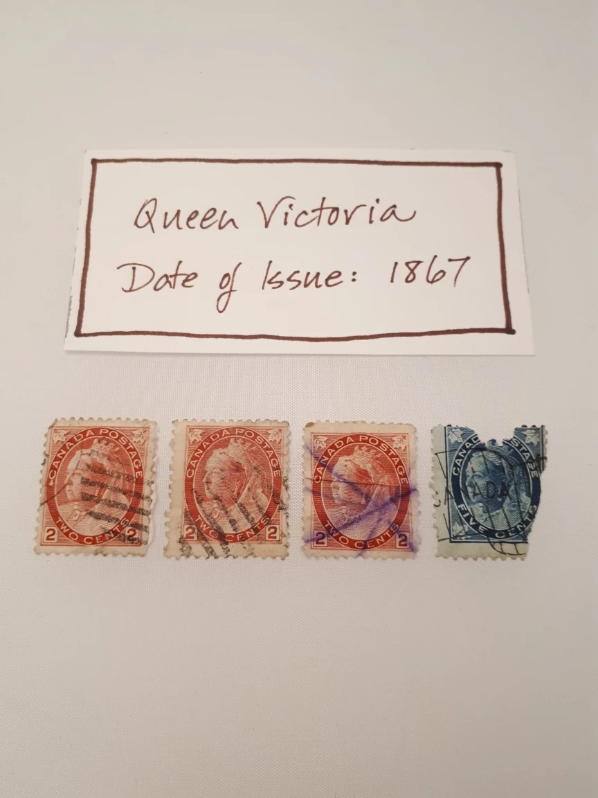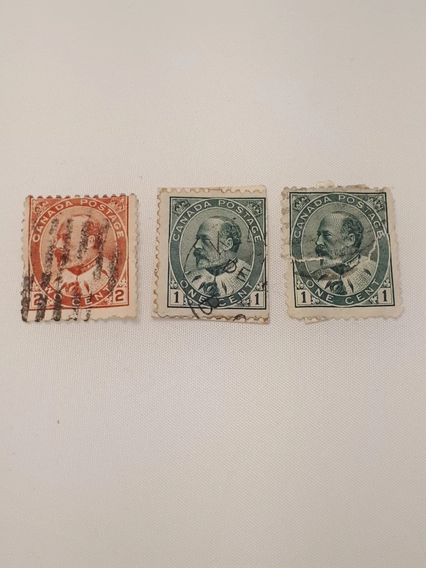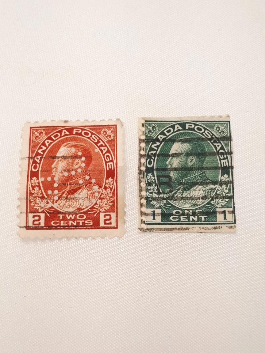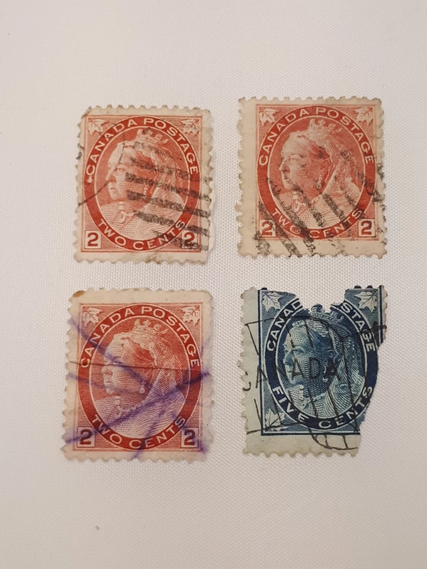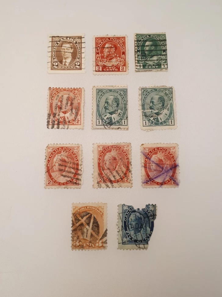 Read descriptions & details below, and see all photos. These are VERY old stamps that have been used/cancelled. Conditions vary. • Queen Victoria, issued 1867: 3 x 2¢ (red) + 1 x 5¢ (blue, torn/incomplete). • Queen Victoria, issued 1870: 1 x 3¢ (orange, cancelation mark obscures much of image). • King Edward VII, issued 1903: 2 x 1¢ (green) + 1 x 2¢ (red). • King George V, issued 1915-1924: 1 x 2¢ (red) + 1 x 1¢ (green). • King George VI, issued 1937: 1 x 2¢ (brown). Price is for the lot (all 11 stamps). Pick up from Yonge & St Clair, or I can post them to you.