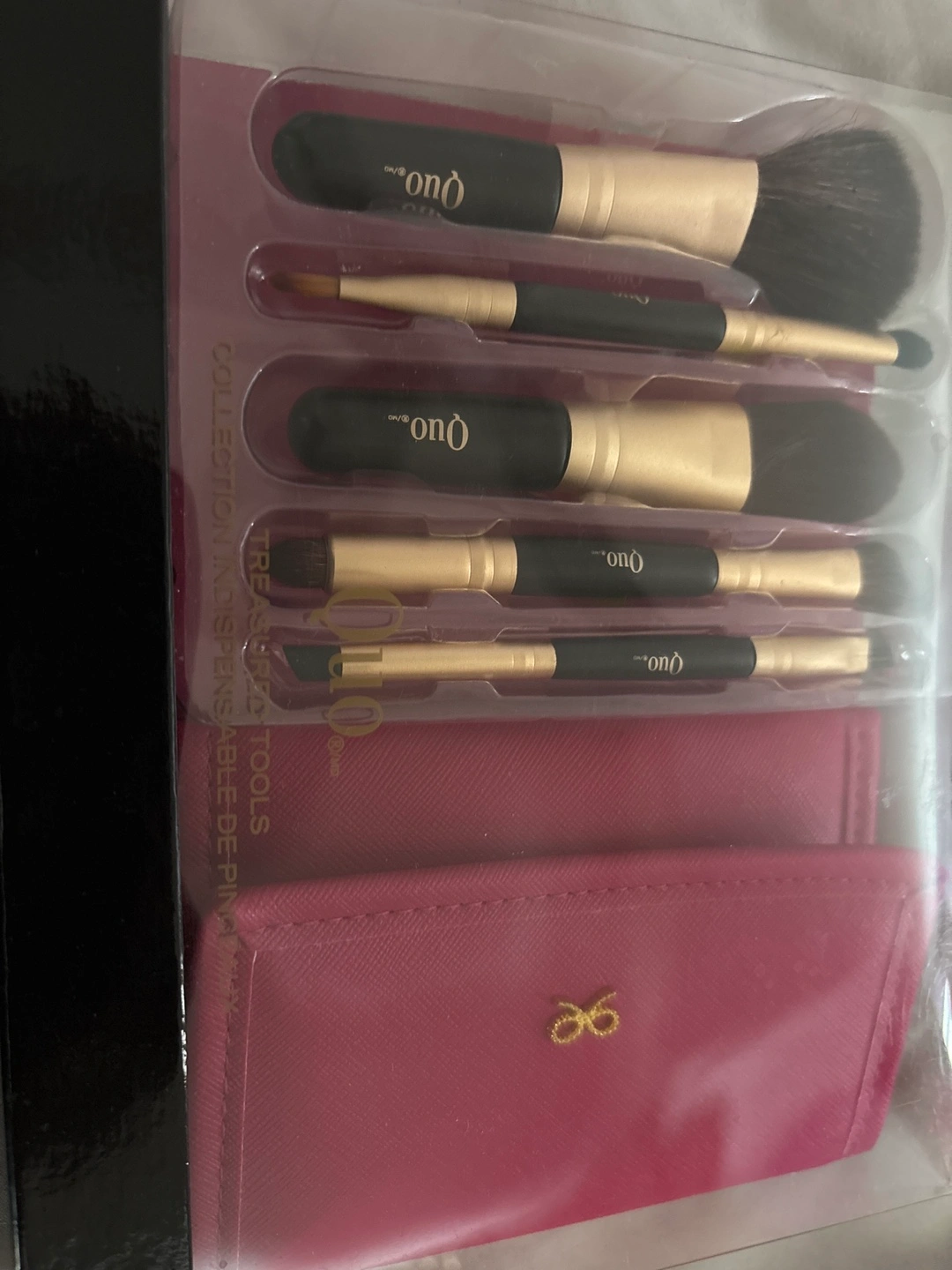 Five-piece makeup brush set. Gold and black handles. Includes carrying case. New.