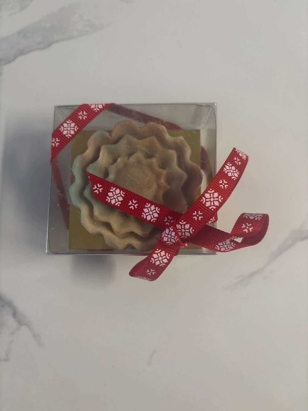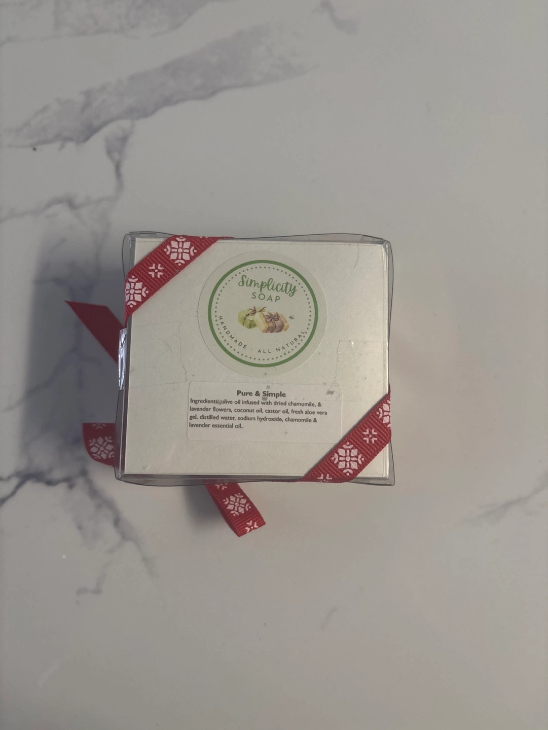 Small, uniquely shaped soap. Presented in a clear box with a red ribbon. Infused with dried chamomile and lavender essential oil. All natural ingredients.