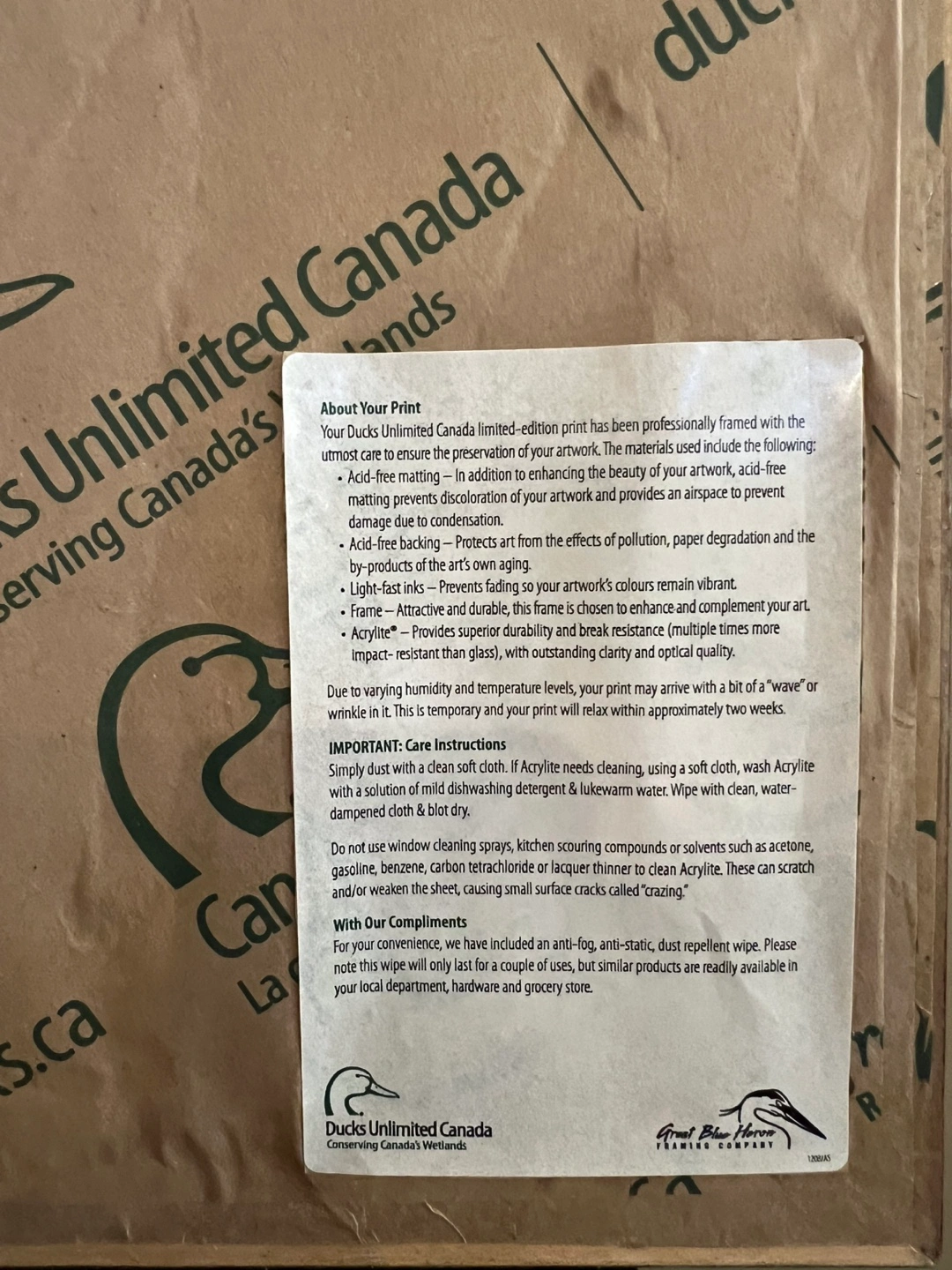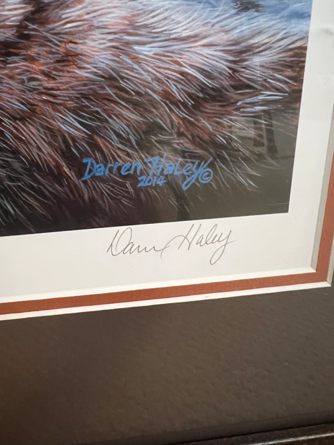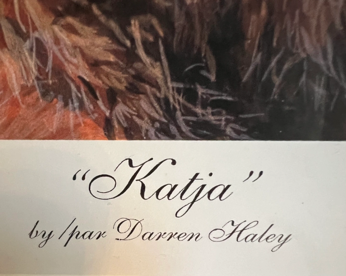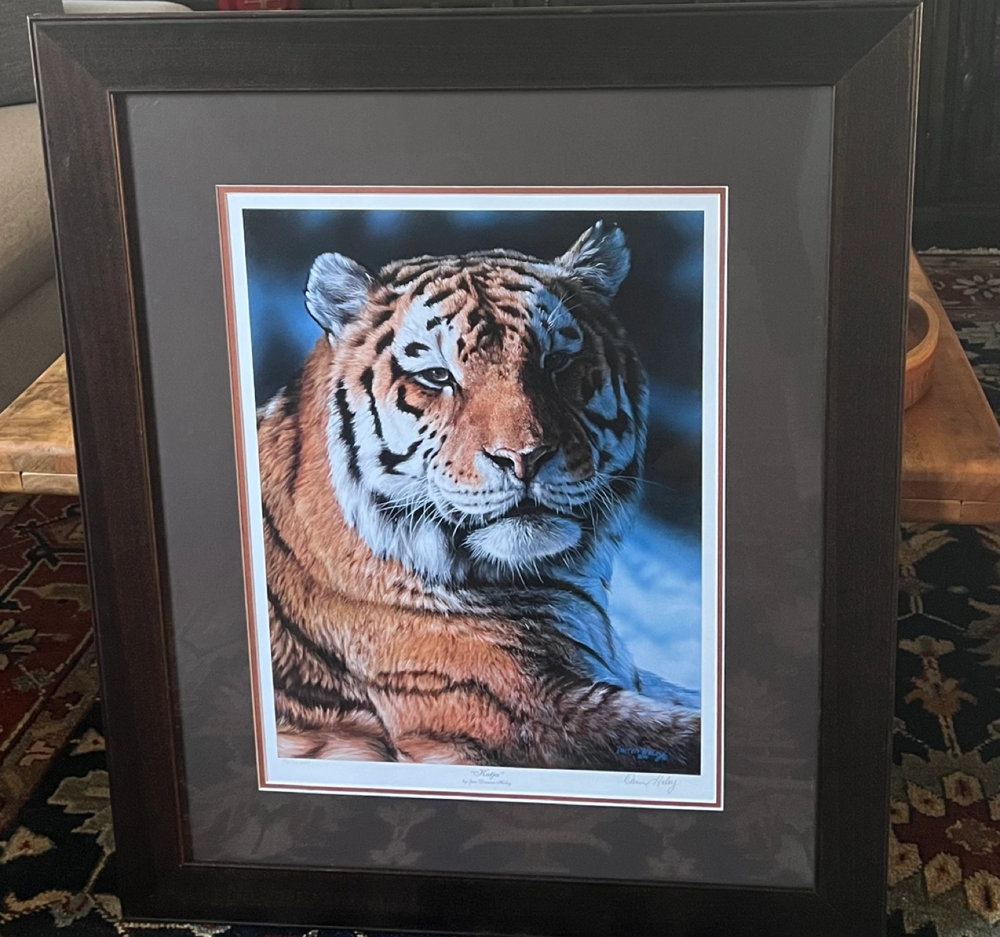 Meet “Katja” Siberian Tiger Isn’t she magnificent and beautiful? Ducks Unlimited Canada limited edition print Professionally framed (acid-free matting,attractive wooden frame to enhance and complement the print etc…) Numbered 962/1300 Signed Darren Haley Gallery quality Ready to hang Great condition 27.5” x 33” (entire frame) Wild life admirer? Photography enthusiast? Art lover? Perfect art piece for your office, study, living room… Note - I removed original backing paper in order to fully clean the glass, the new paper backing was installed but I retained a piece of the original with Ducks Unlimited logo and information about the print (see my photos) Asking $40 Interested? Message me and please check my other listings…
