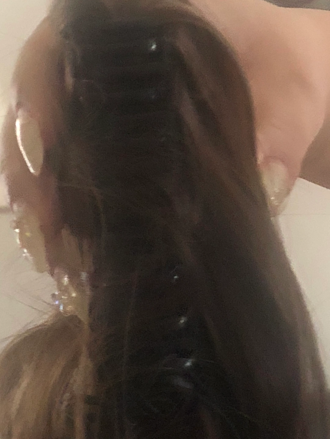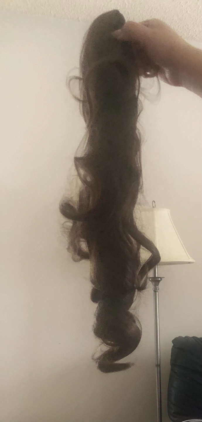 Long brown clip-in ponytail hair extension. Wavy style. Looks natural. Great for adding length and volume.