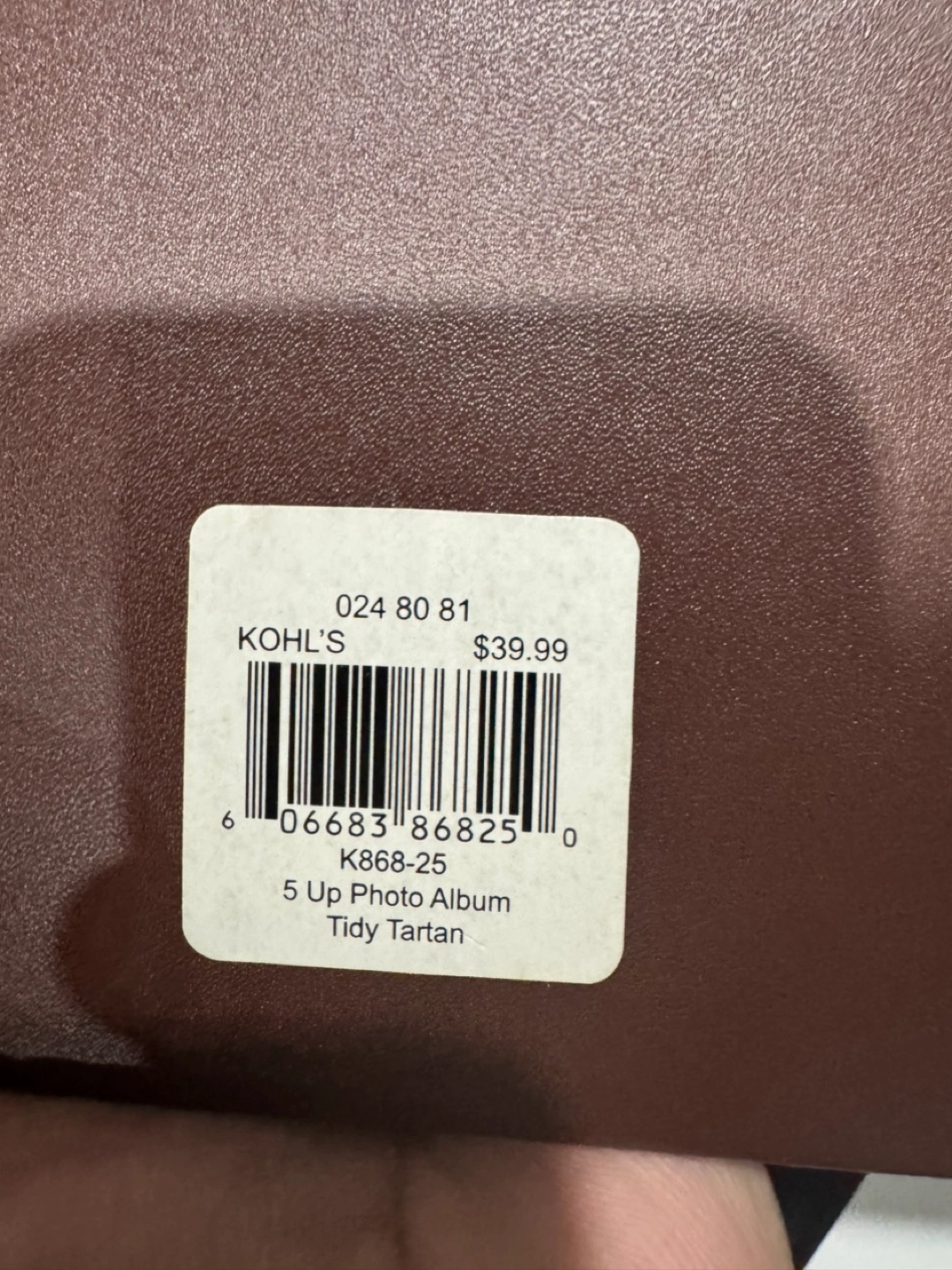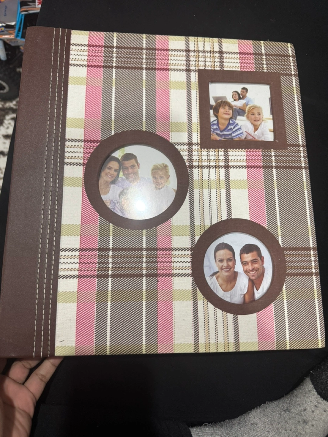 Brown photo album. Plaid patterned cover. Multiple plastic sleeves for photos. Great for storing memories. I have 2 2 for 15 1 for 10