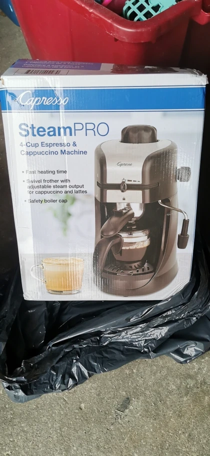 New in box. Makes 4 cups of espresso and cappuccino. Features fast heating time, swivel frother with adjustable steam output, and safety boiler cap.