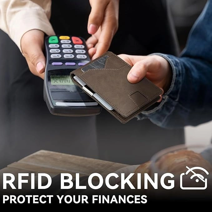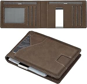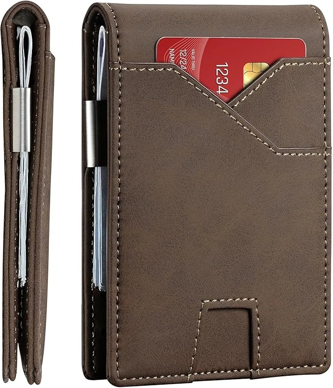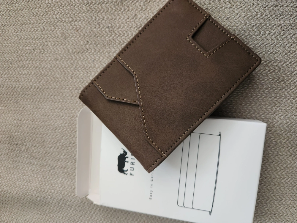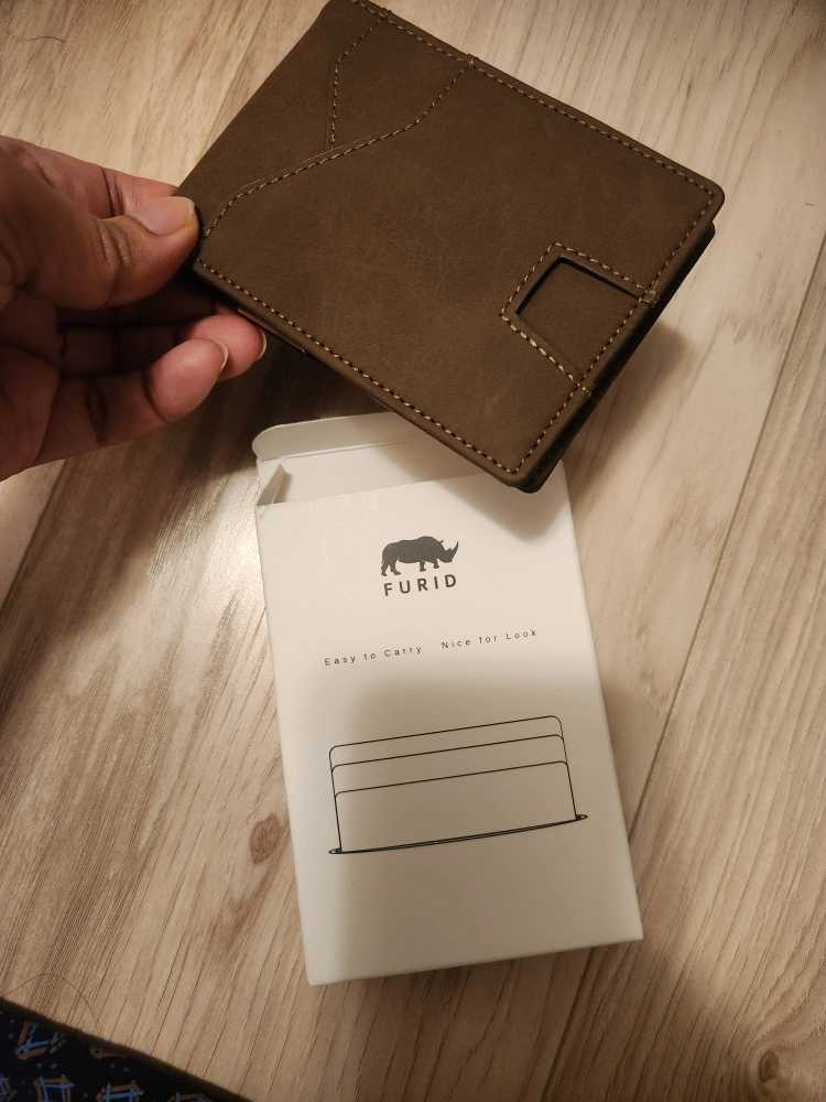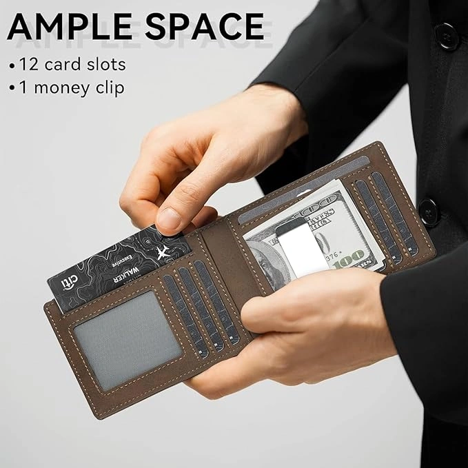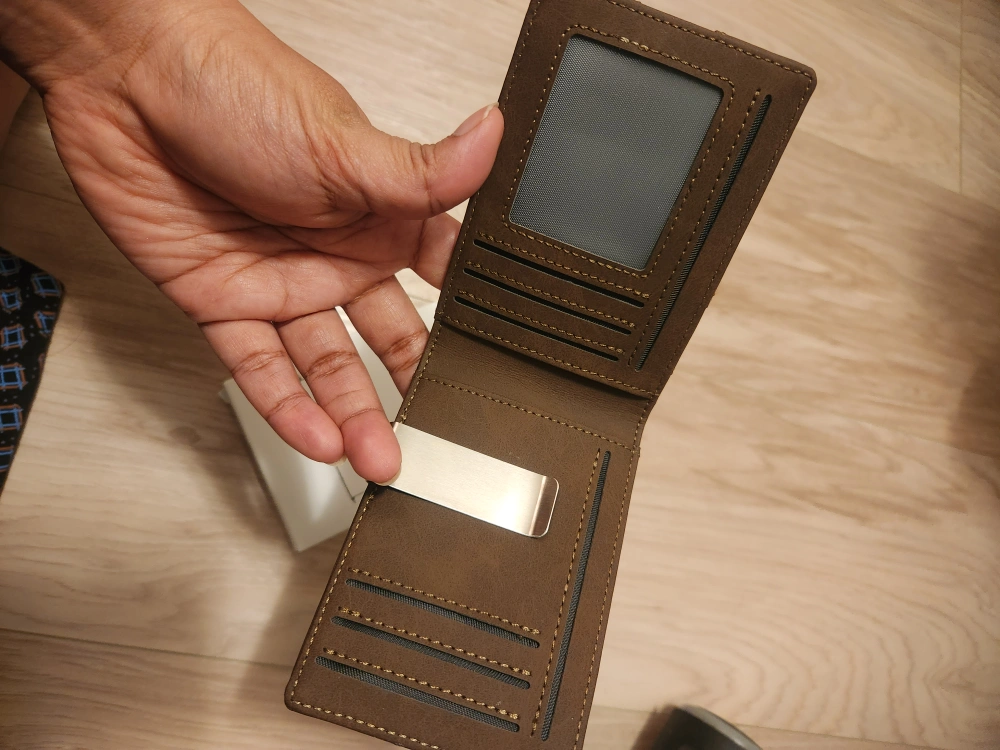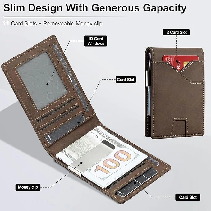 Meet up at 280 Donlands Avenue or 40 Lavery Trail. Brown leather bifold wallet. Features 12 card slots, a removable money clip, and RFID blocking technology. Slim and stylish design. Holds cards and cash securely.