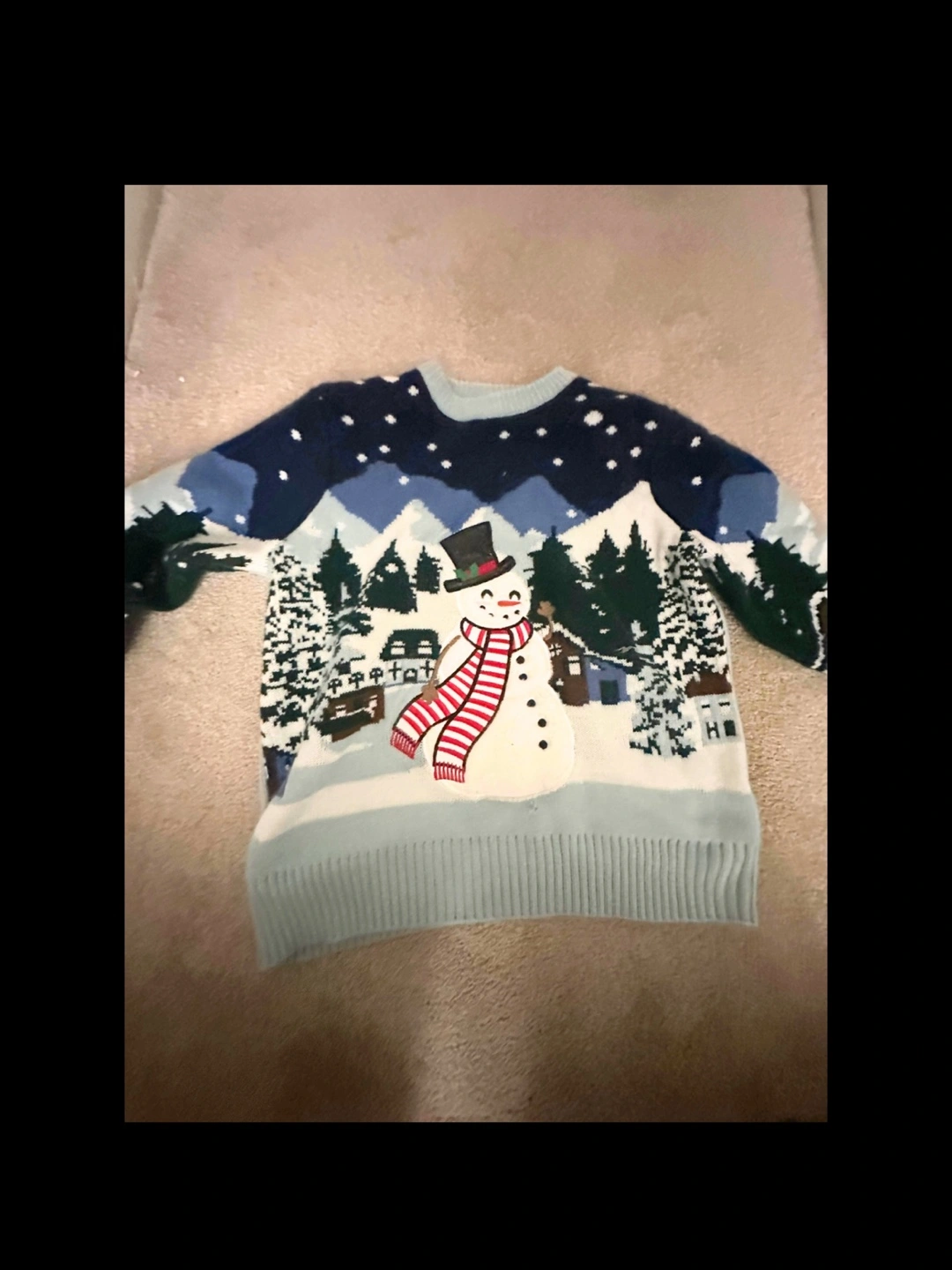 Adorable child's Christmas sweater. Features a snowman design against a winter scene. Long sleeves, crew neck. Perfect for the holidays!