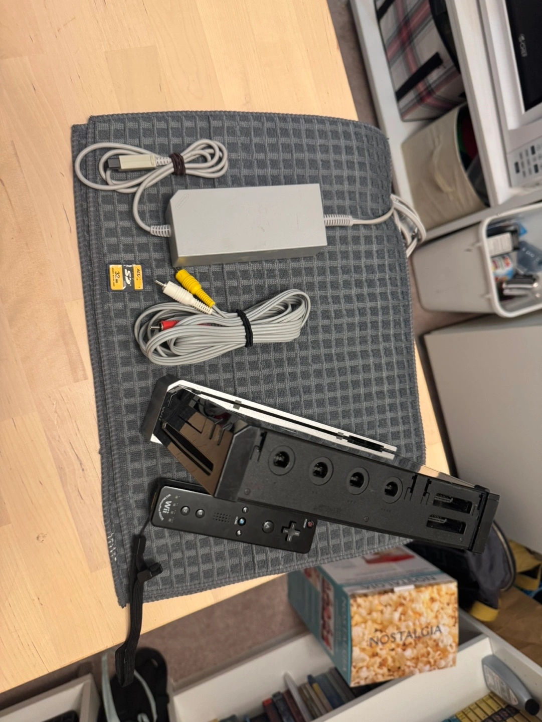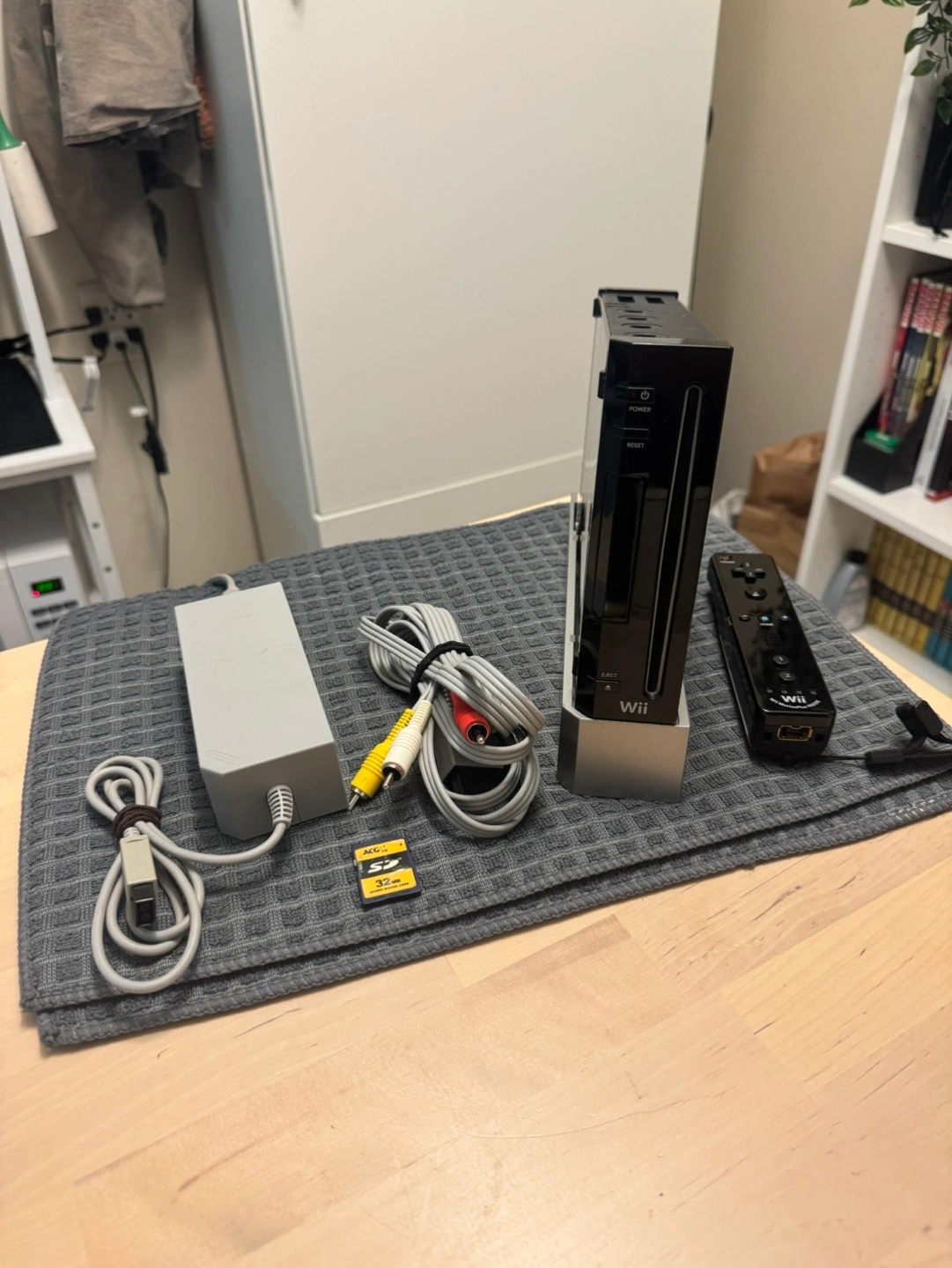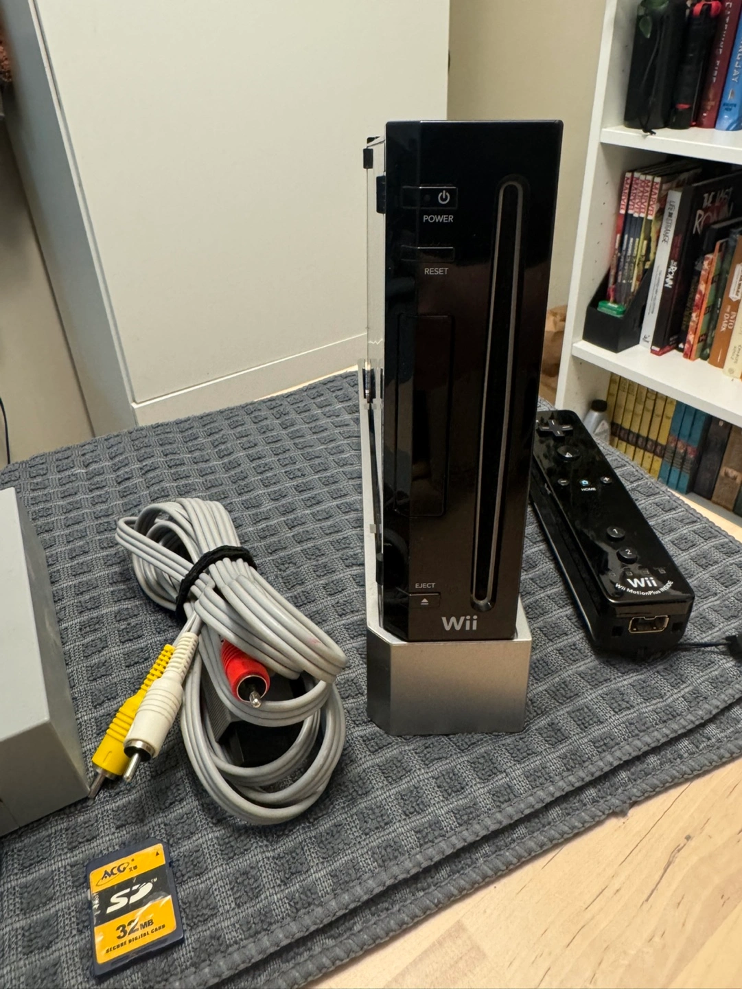 Black Wii console. Includes power supply, AV cable, Wii motion plus remote, and stand and SD card & Sensor Bar. Great for retro gaming.