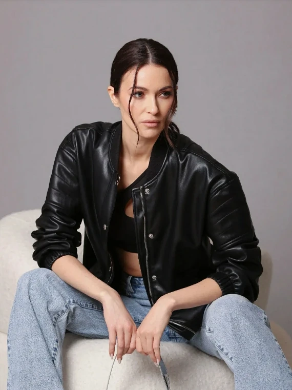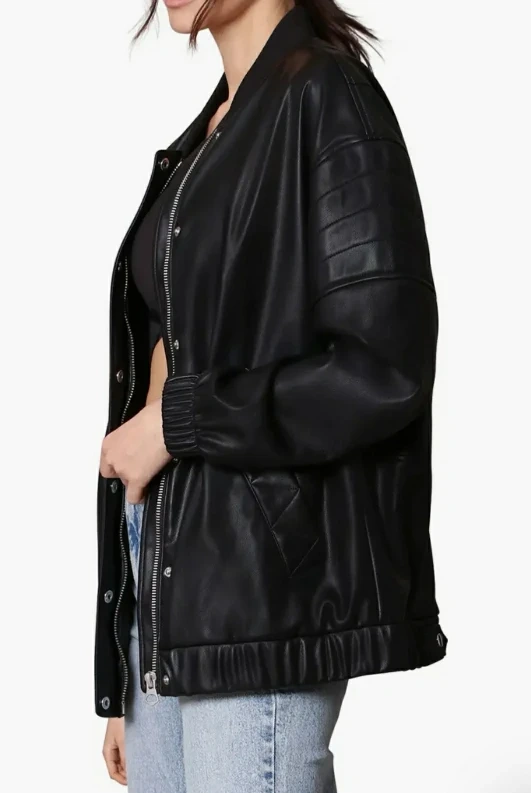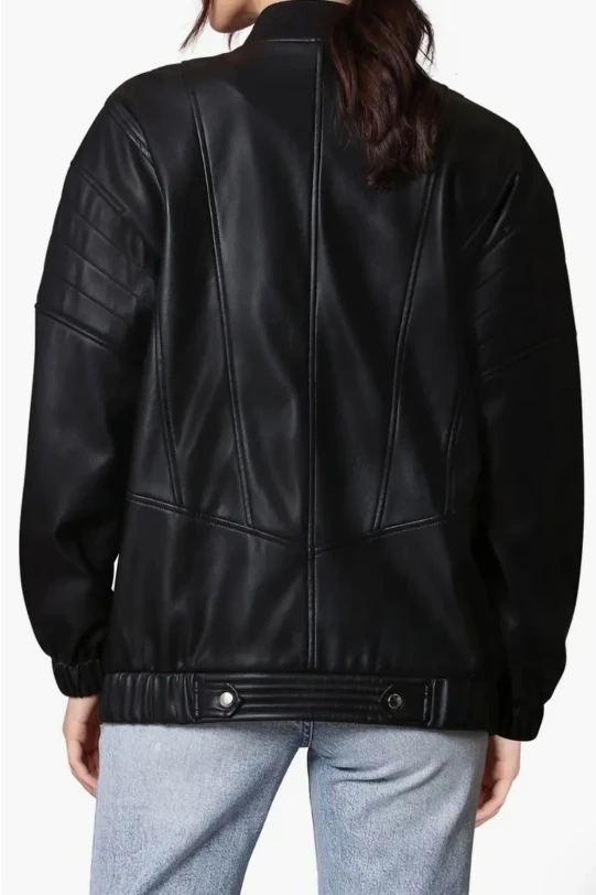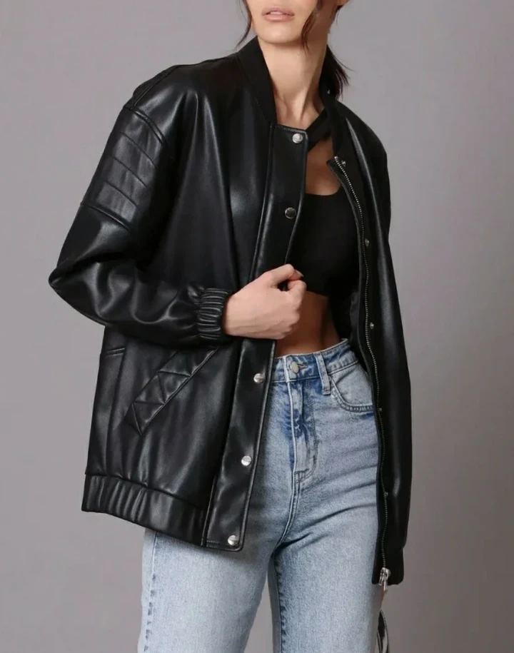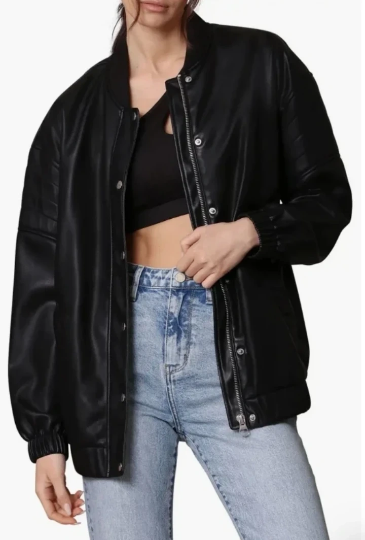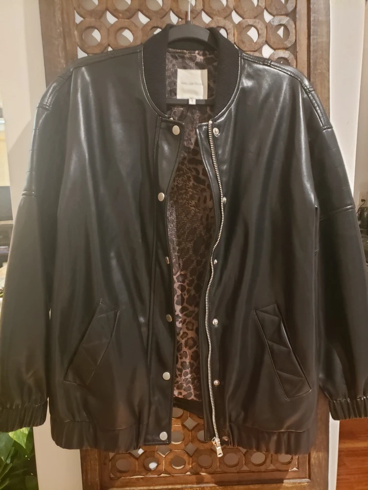 Women's black leather bomber jacket. Features a zip and snap closure, ribbed cuffs and hem, and two welt pockets. Leopard print lining with interior chest pocket. Only worn once. Great condition. Originally $80.
