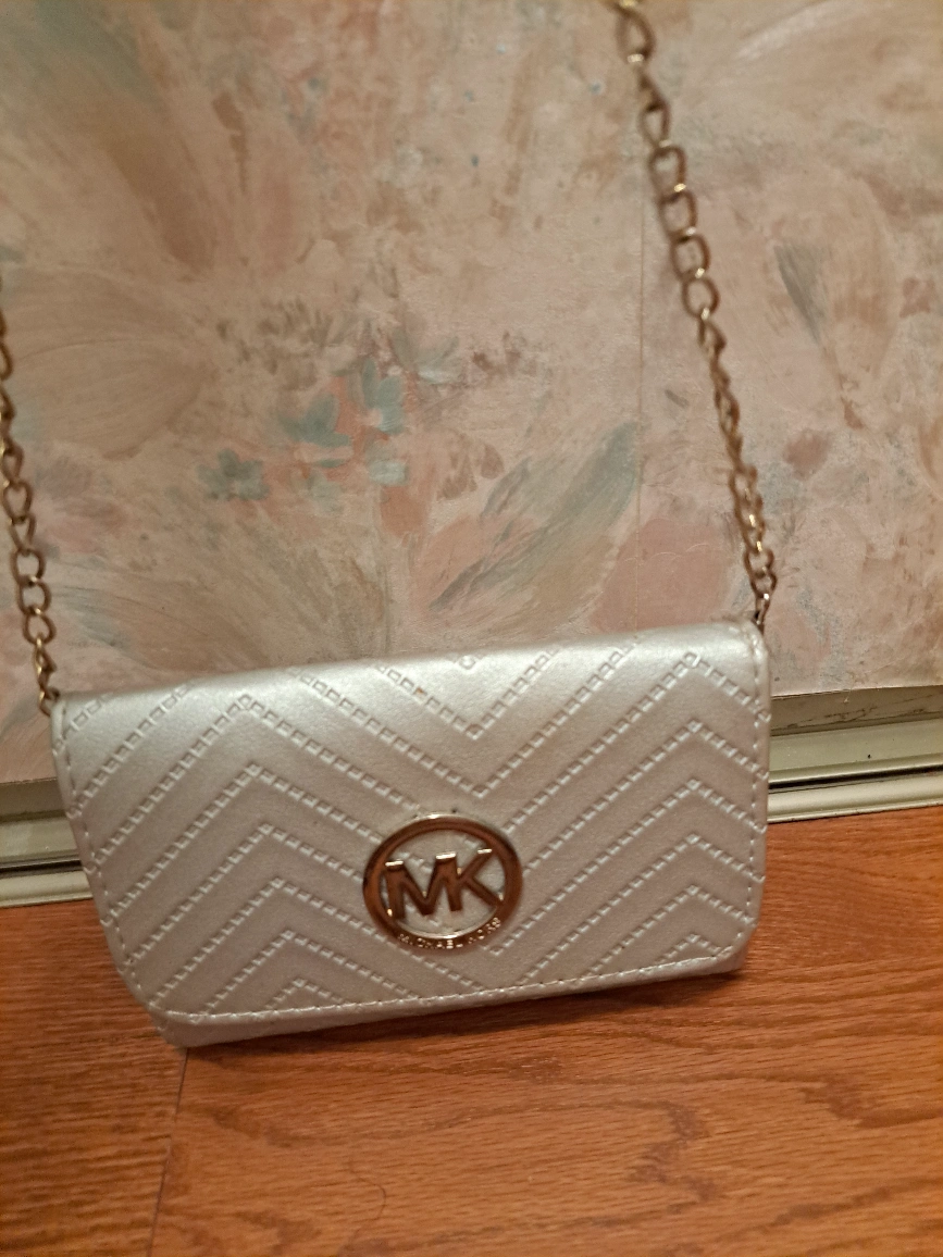 Silver chain wallet. Chevron pattern. Gold MK logo. Small, compact design. Perfect for evenings out. Cash Only! We'll meet at the Eaton Centre!