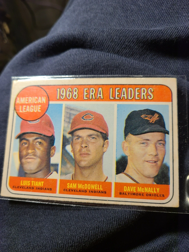 Vintage baseball card featuring Luis Tiant, Sam McDowell, and Dave McNally. American League 1968 ERA leaders. Shows player stats on the back. Good condition.