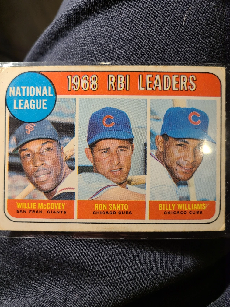 Vintage 1969 Topps baseball card. Features Willie McCovey, Ron Santo, and Billy Williams. National League 1968 RBI leaders. Card shows some wear.